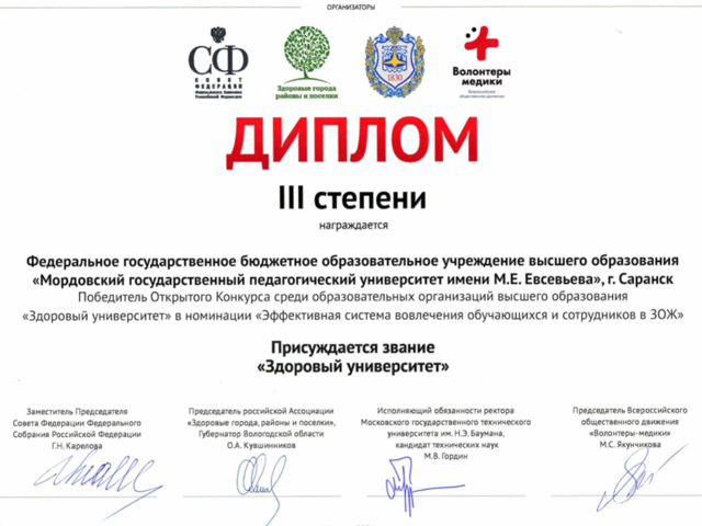 МГПУ имени М.Е. Евсевьева награжден дипломом III степени в номинации конкурса «Эффективная система вовлечения обучающихся и сотрудников в ЗОЖ». Вузу присвоено почетное звание «Здоровый университет». Поздравляем коллектив нашего педагогического университета и желаем новых достижений!