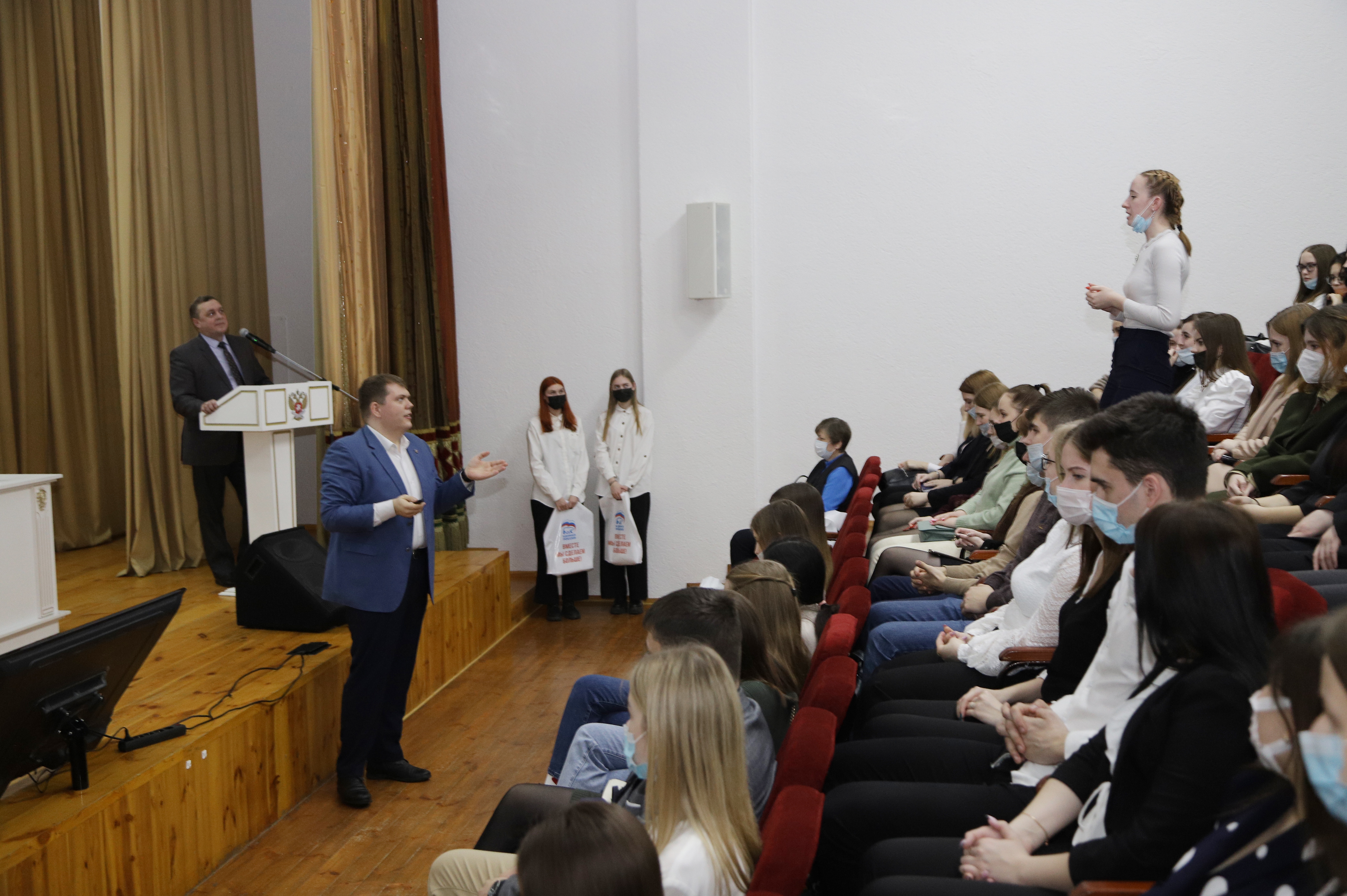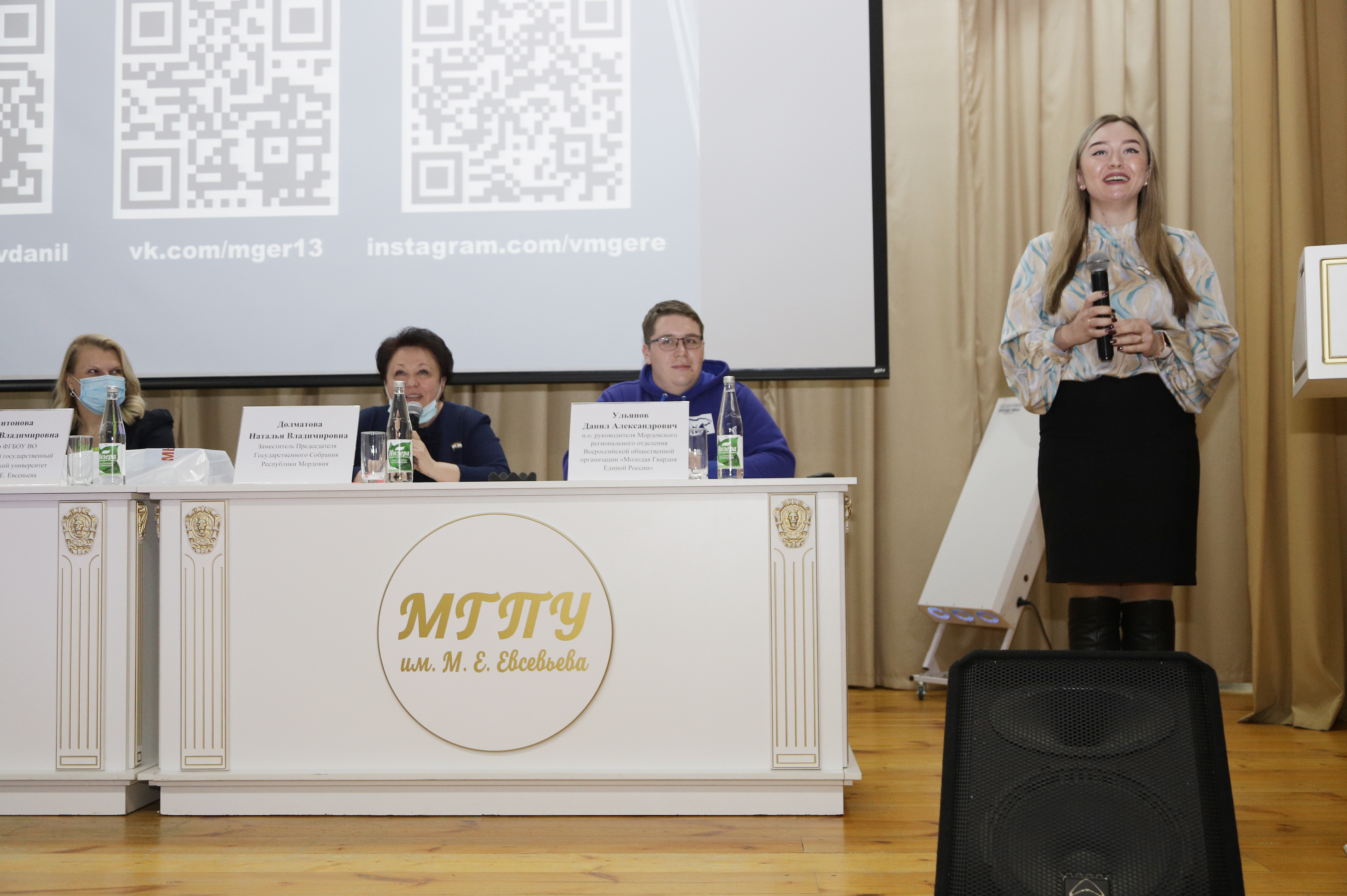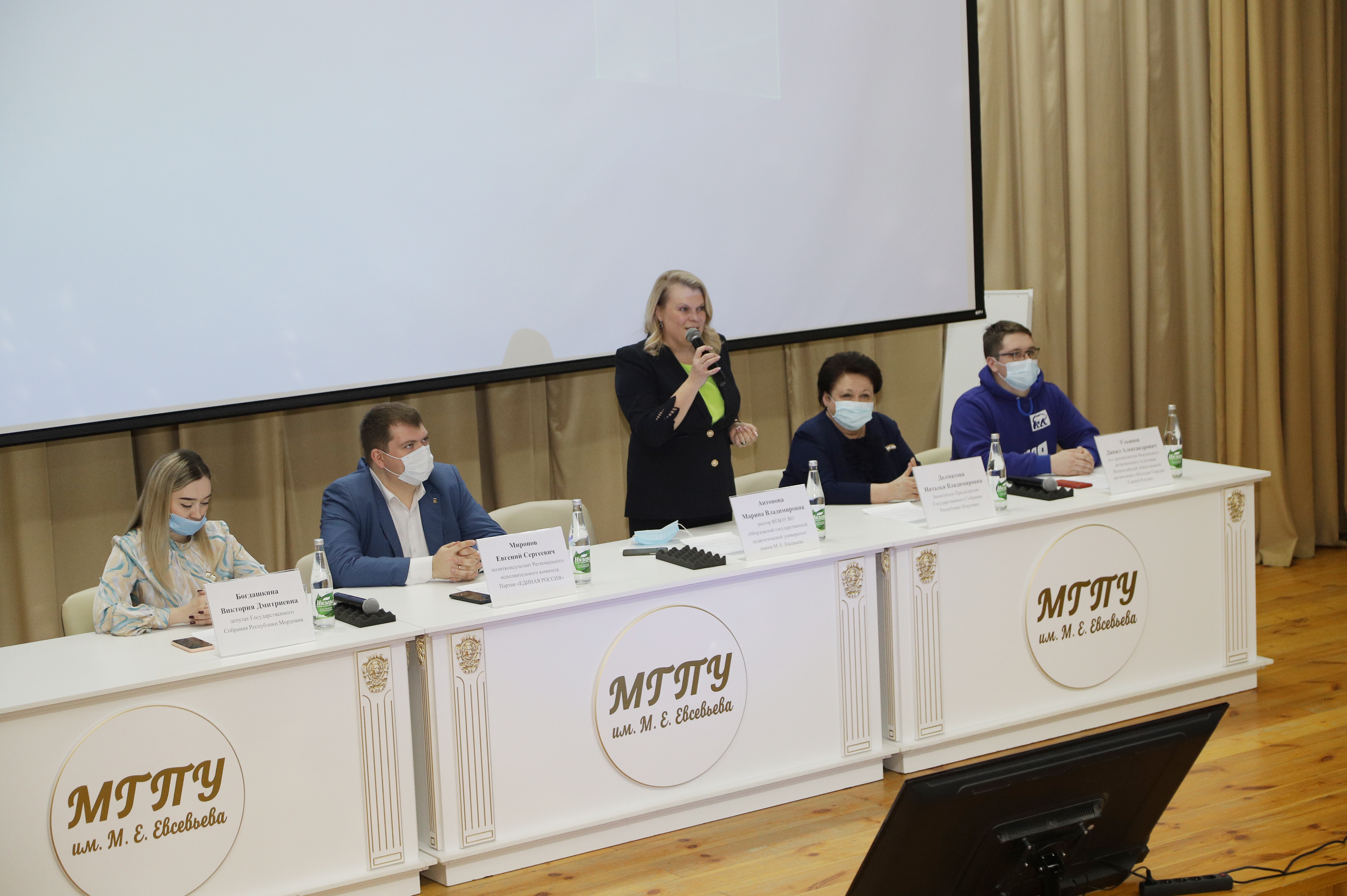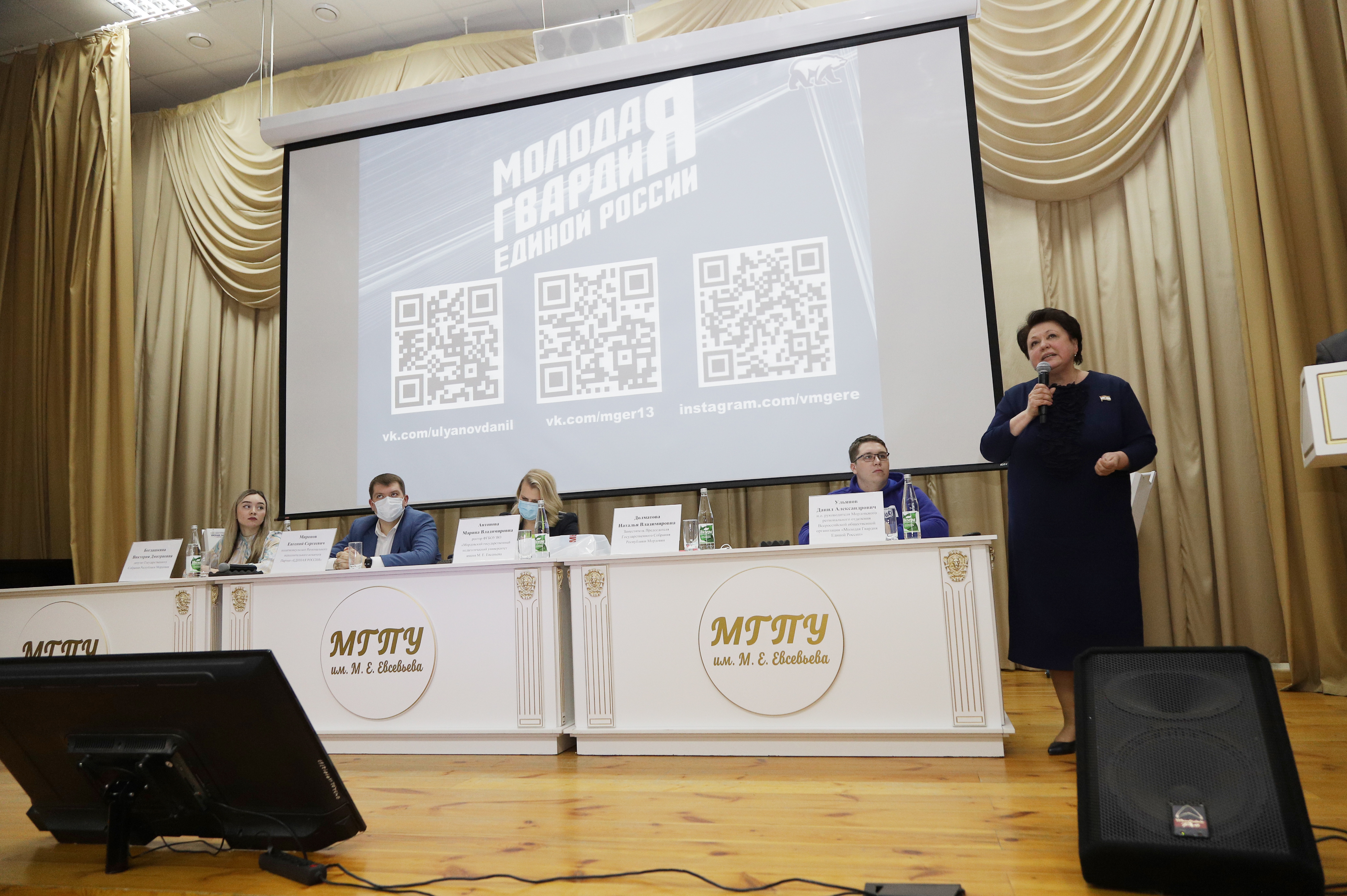 Заместитель Председателя Государственного Собрания республики Мордовия Наталья Владимировна Долматова обратилась к молодым сторонникам партии «Единая Россия» с призывом принимать активное участие в реализации социально значимых проектов. Ректор университета Марина Владимировна Антонова пожелала студентам смелее предпринимать первые шаги в большой политике, быть настойчивыми, целеустремленными и креативными в решении общественных и государственных вопросов.