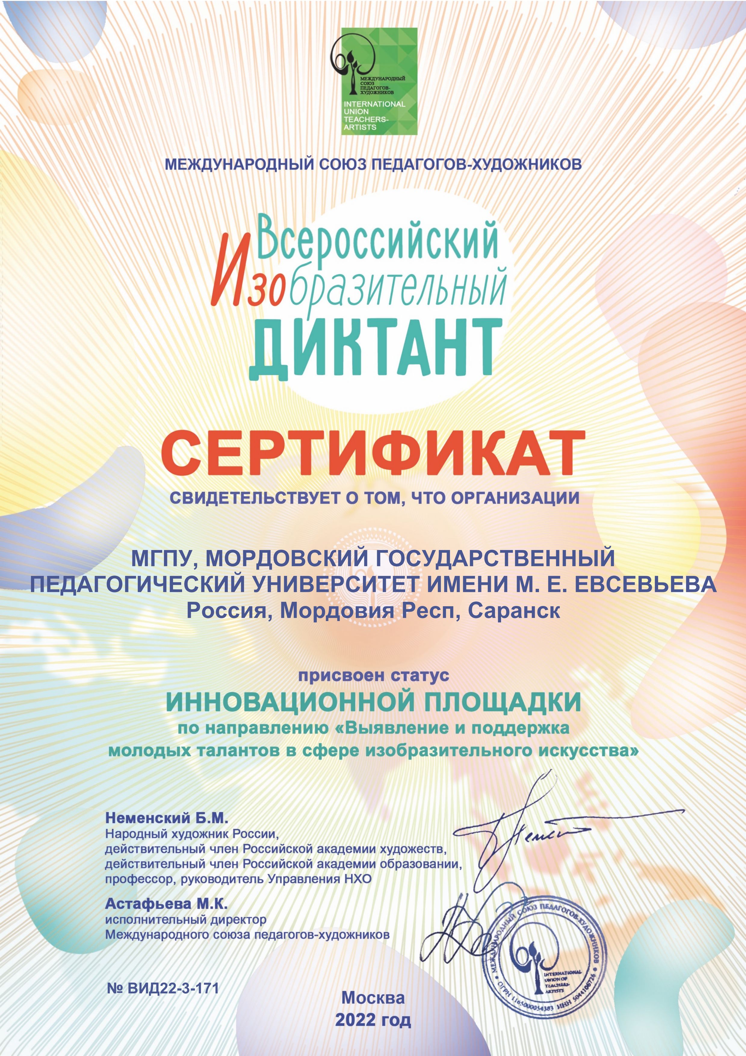 За достигнутые успехи МГПУ имени М. Е. Евсевьева присвоен статус «ИННОВАЦИОННАЯ ПЛОЩАДКА» по направлению «Выявление и поддержка молодых талантов в сфере изобразительного искусства».