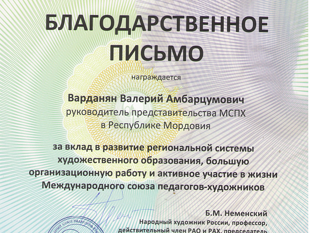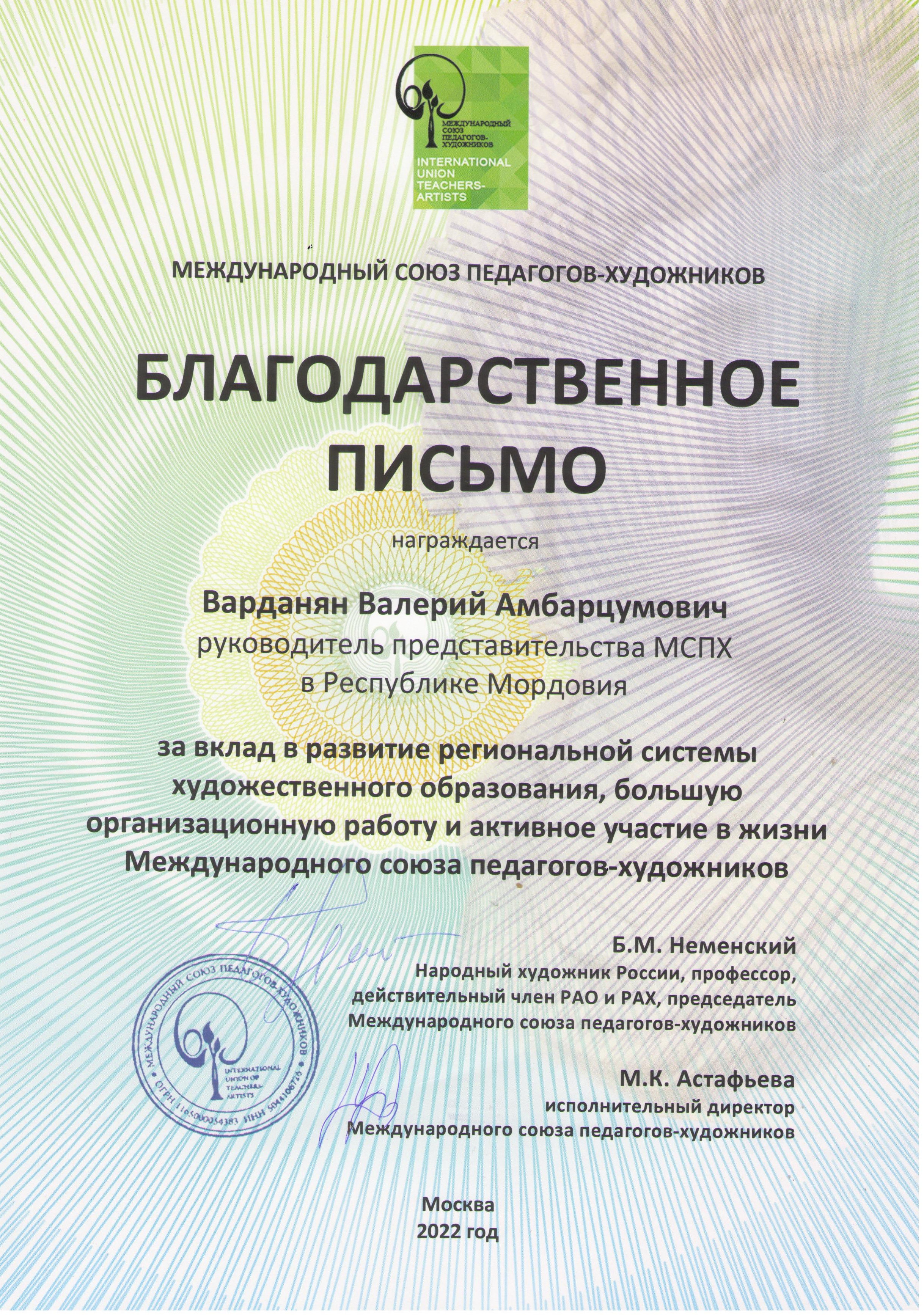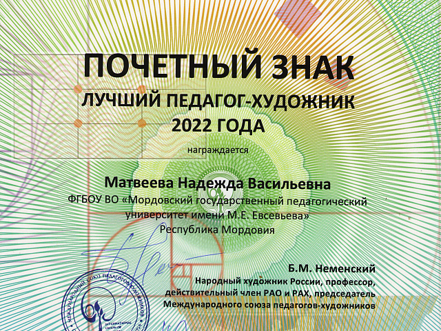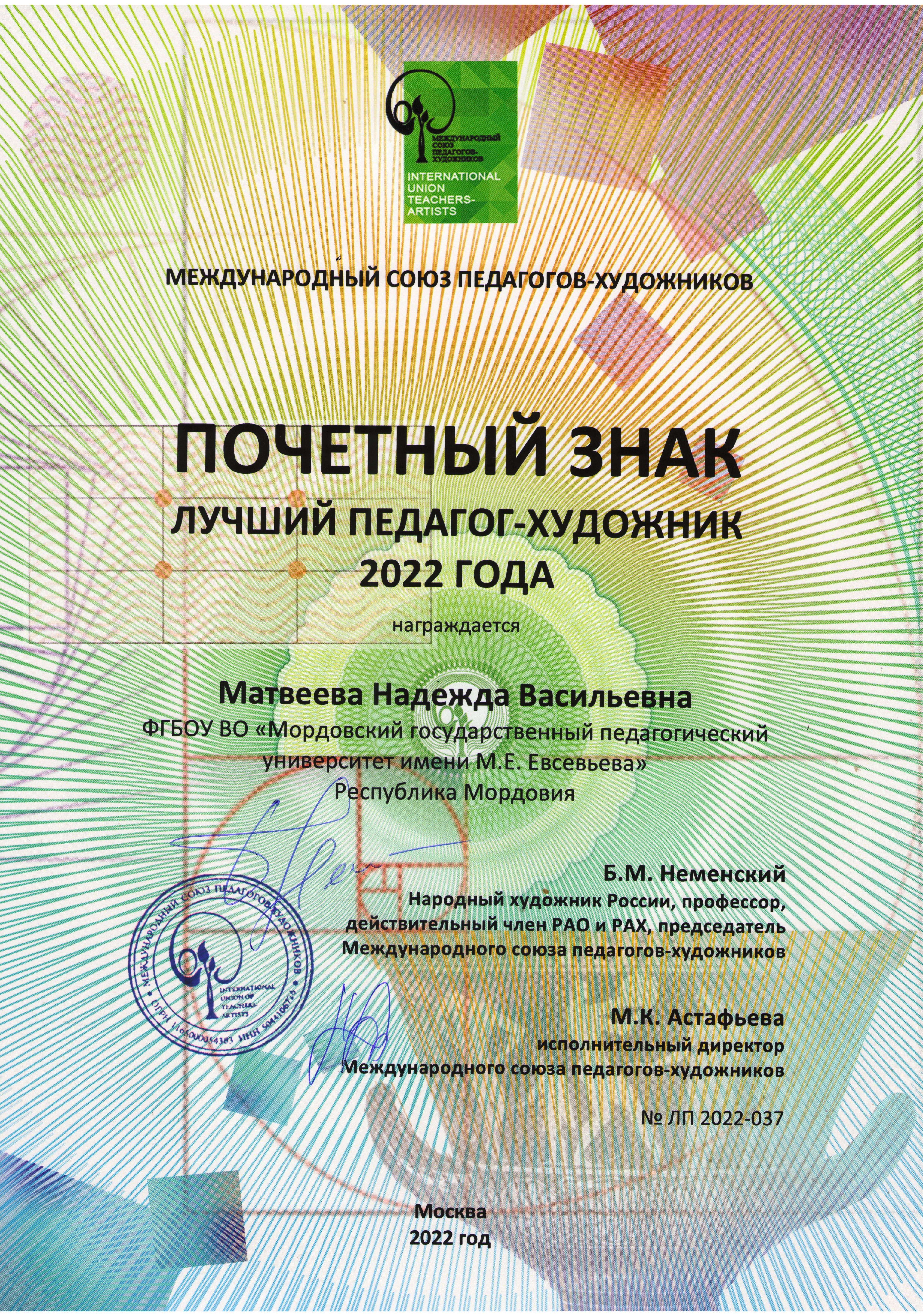 ЗА ВКЛАД В РАЗВИТИЕ РЕГИОНАЛЬНОЙ СИСТЕМЫ ХУДОЖЕСТВЕННОГО ОБРАЗОВАНИЯ, БОЛЬШУЮ ОРГАНИЗАЦИОННУЮ РАБОТУ И АКТИВНОЕ УЧАСТИЕ В ЖИЗНИ МЕЖДУНАРОДНОГО СОЮЗА ПЕДАГОГОВ-ХУДОЖНИКОВ В. А. ВАРДАНЯНУ ВРУЧИЛИ БЛАГОДАРСТВЕННОЕ ПИСЬМО. СТАРШИЙ ПРЕПОДАВАТЕЛЬ КАФЕДРЫ ХУДОЖЕСТВЕННОГО И МУЗЫКАЛЬНОГО ОБРАЗОВАНИЯ Н. В. МАТВЕЕВА НАГРАЖДЕНА ПОЧЕТНЫМ ЗНАКОМ «ЛУЧШИЙ ПЕДАГОГ-ХУДОЖНИК 2022 ГОДА».