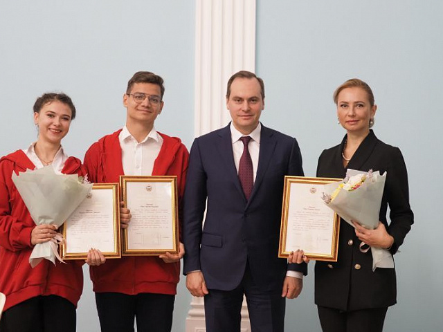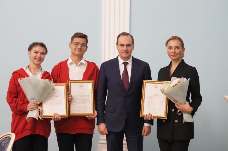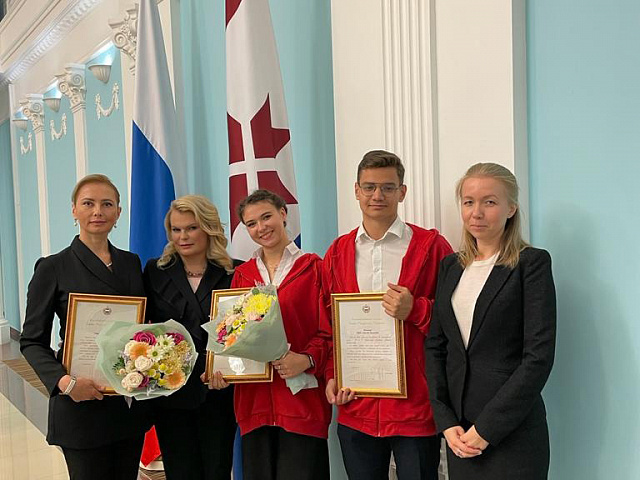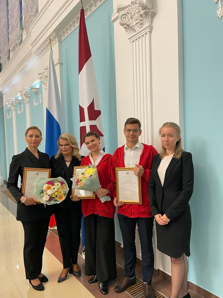 Артём Алексеевич вручил благодарственные письма Перфиловой Татьяне и Балясникову Юрию, а также их педагогу-наставнику Кижаевой Дарье Валерьевне, руководителю штаба студенческих отрядов МГПУ.