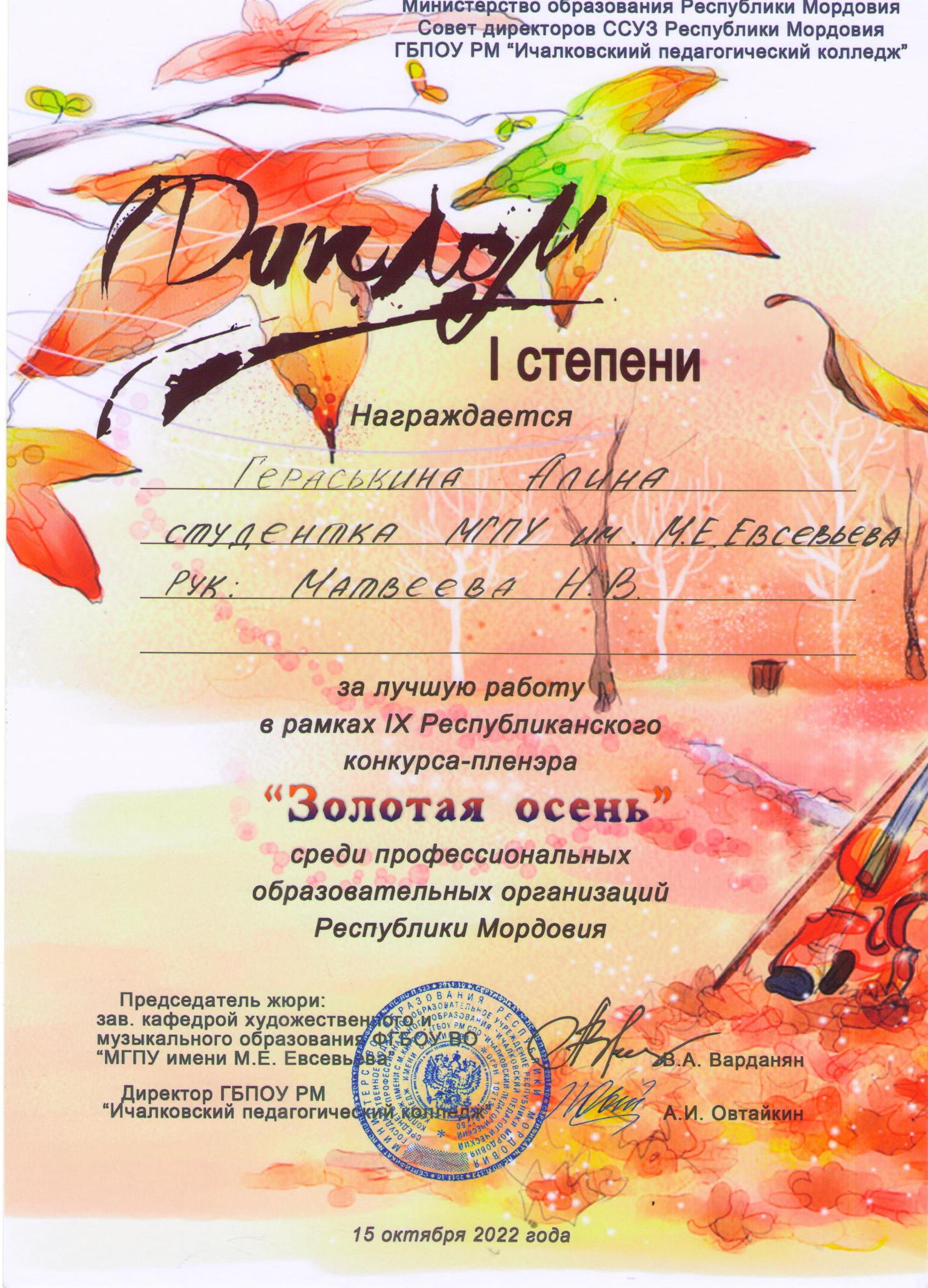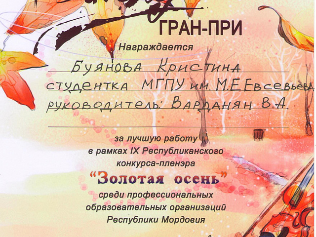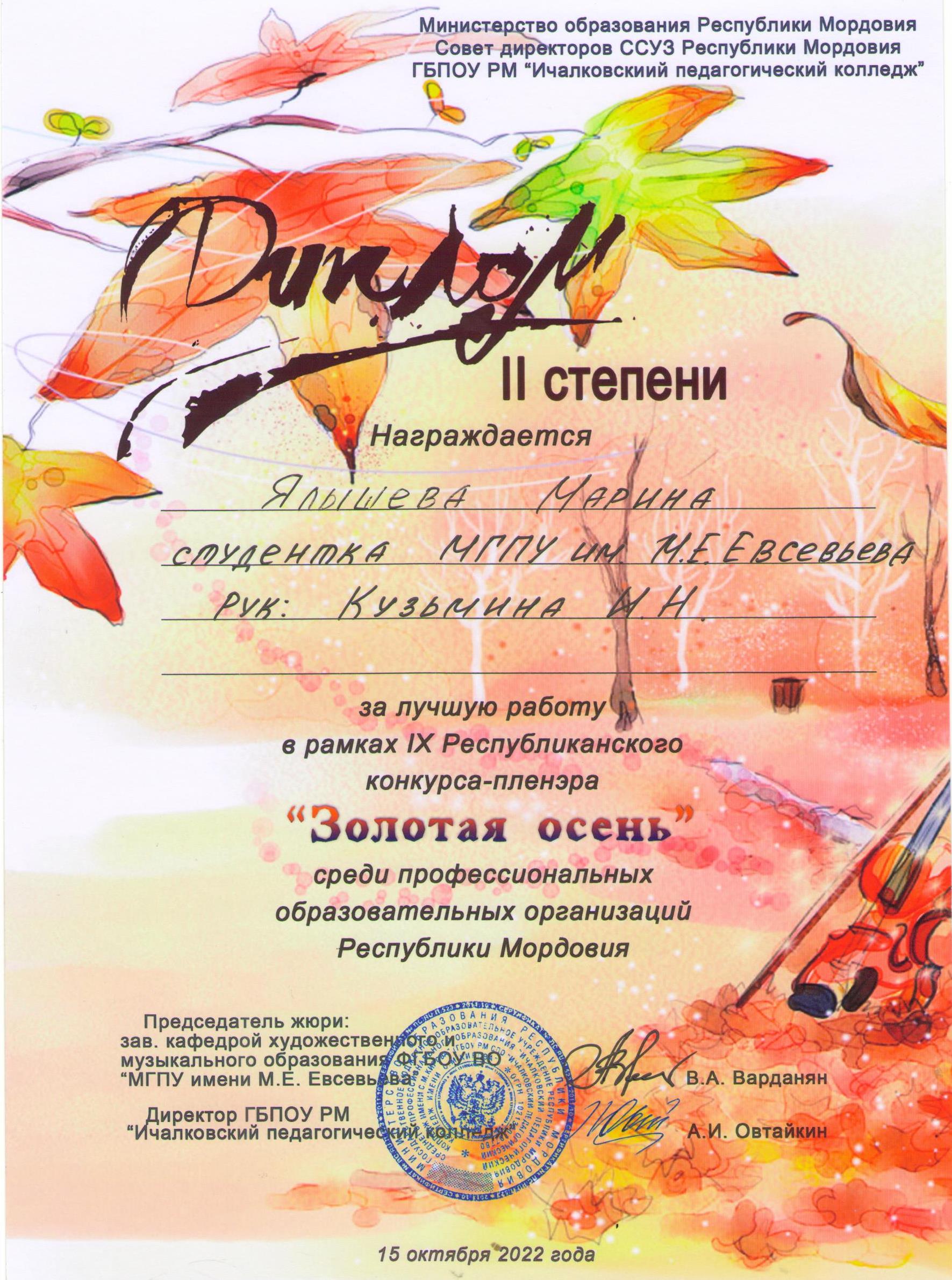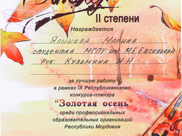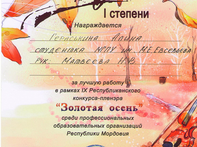 15 октября на базе оздоровительного лагеря «Вастома» прошел IX Республиканский конкурс-пленэр среди студентов творческих факультетов и отделений профессиональных образовательных организаций Республики Мордовия «Золотая осень».