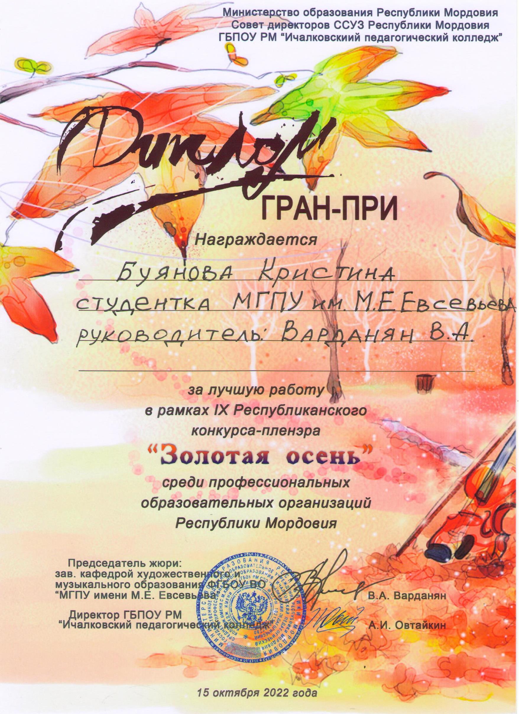 Дипломом Гран-При за лучшую пленэрную работу награждена Буянова Кристина, студентка группы ПДХ-119.