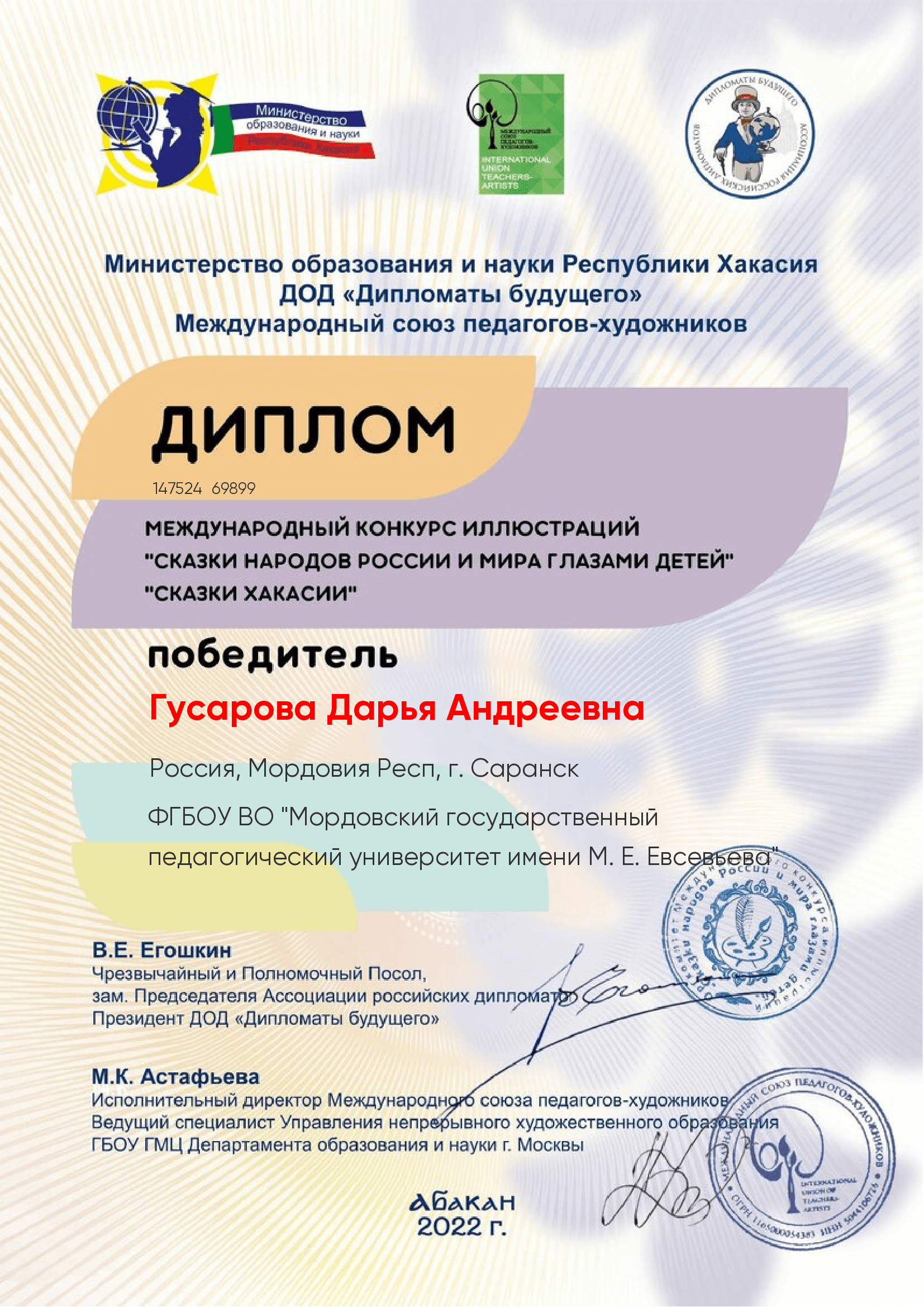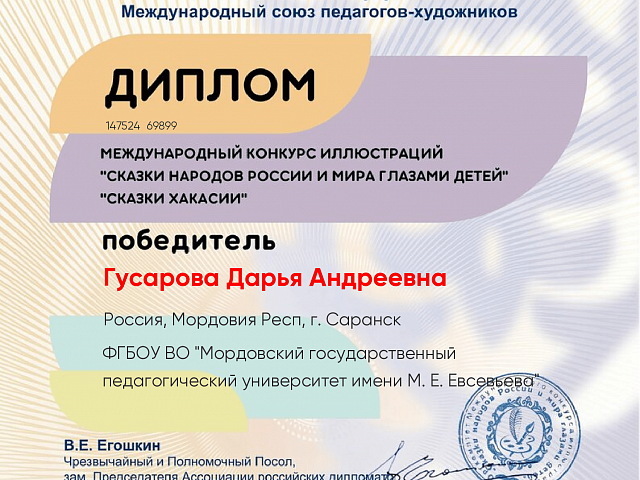 Студентка факультета педагогического и художественного образования Гусарова Дарья, стала победителем VIII Международного конкурса иллюстраций «Сказки народов России и мира глазами детей». Ее иллюстрация к сказке «Атыгчы-оол» будет включена в книгу «Сказки Хакасии», макет которой уже сверстан. Награждение победителей состоится в Москве, в марте 2023 г.