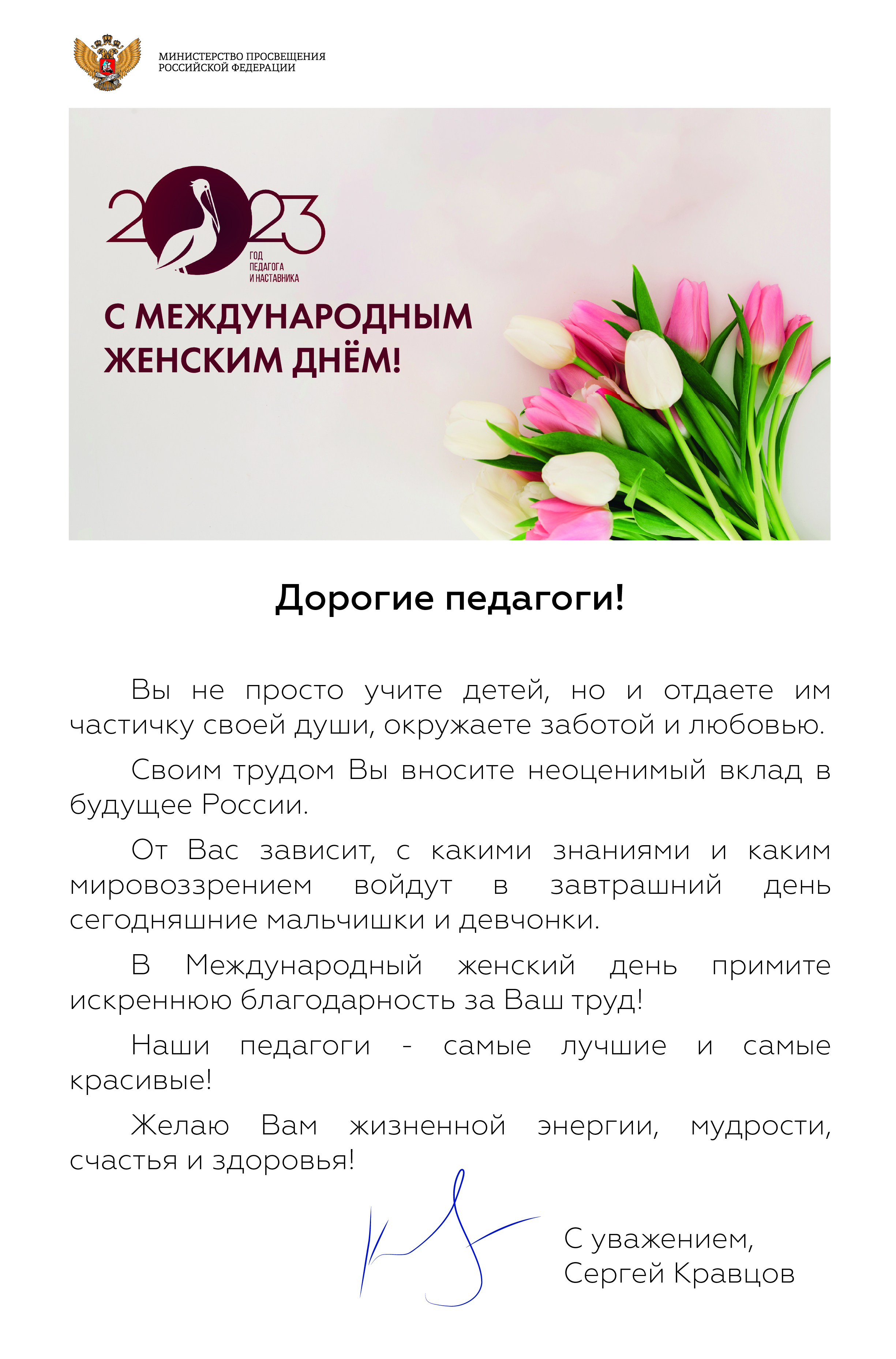 Поздравление Министра Просвещения РФ Кравцова С.С. с Международным женским днем!