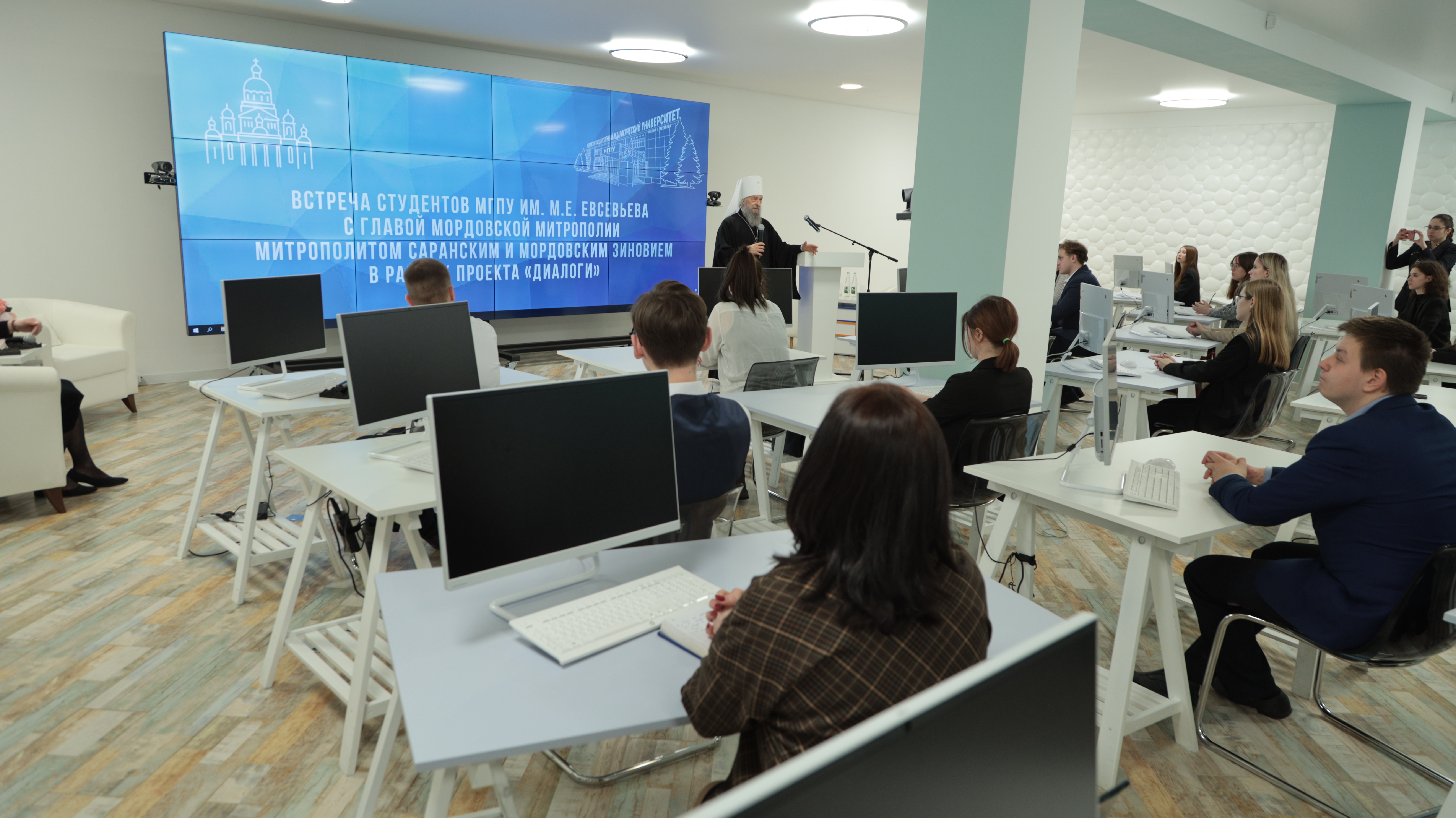 Митрополит Саранский и Мордовский Зиновий поприветствовал участников встречи, отметил, что проект «Диалоги», успешно реализуемый педагогическим университетом, вносит большой вклад в дело развития духовных основ общества, построения позитивных отношений между религиозными организациями и системой образования. Владыка рассказал студентам о духовных основах жизни человека, смысле понятий «вера» и «религия», собственном опыте духовного возрастания.