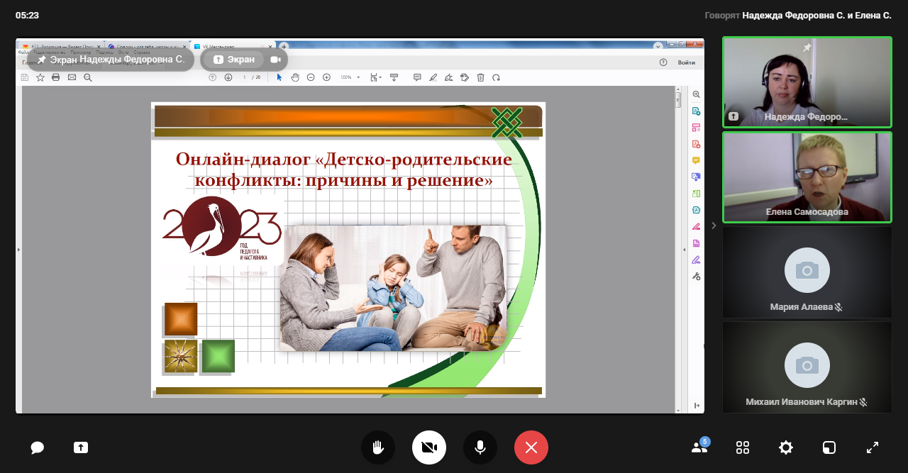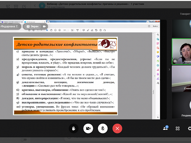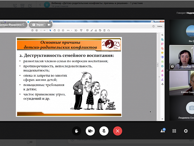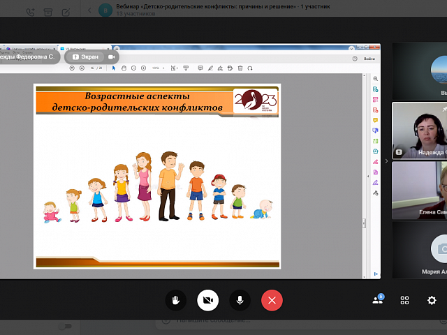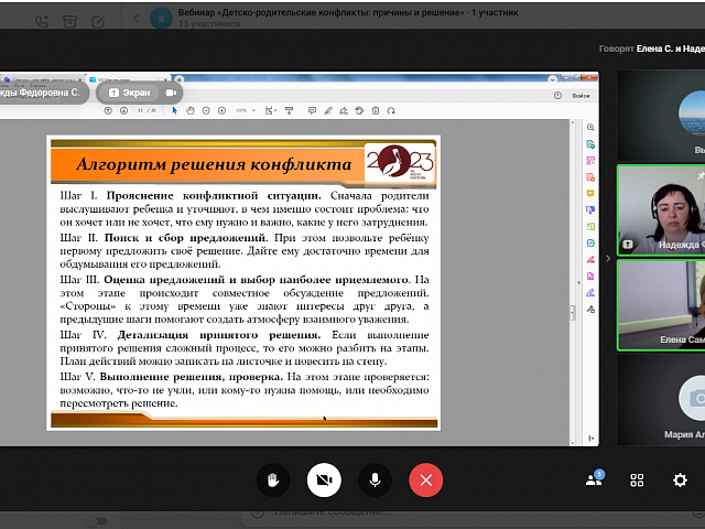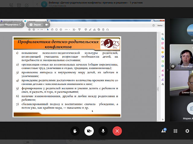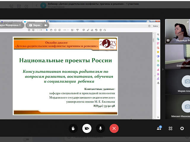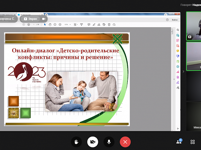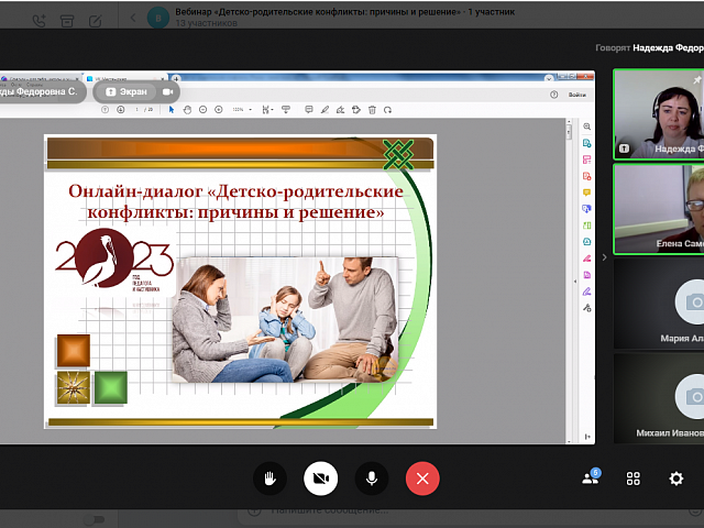 13 апреля 2023 года прошел онлайн-диалог «Детско-родительские конфликты: причины и решение» с родителями обучающихся образовательных организаций г.о. Саранск в формате видеоконференции. Мероприятие проводилось в рамках федерального проекта «Современная школа» национального проекта «Образование» на 2023 год с целью психологического просвещения родителей (законных представителей), оказания им психолого-педагогической помощи в вопросах обучения, воспитания и развития детей.
