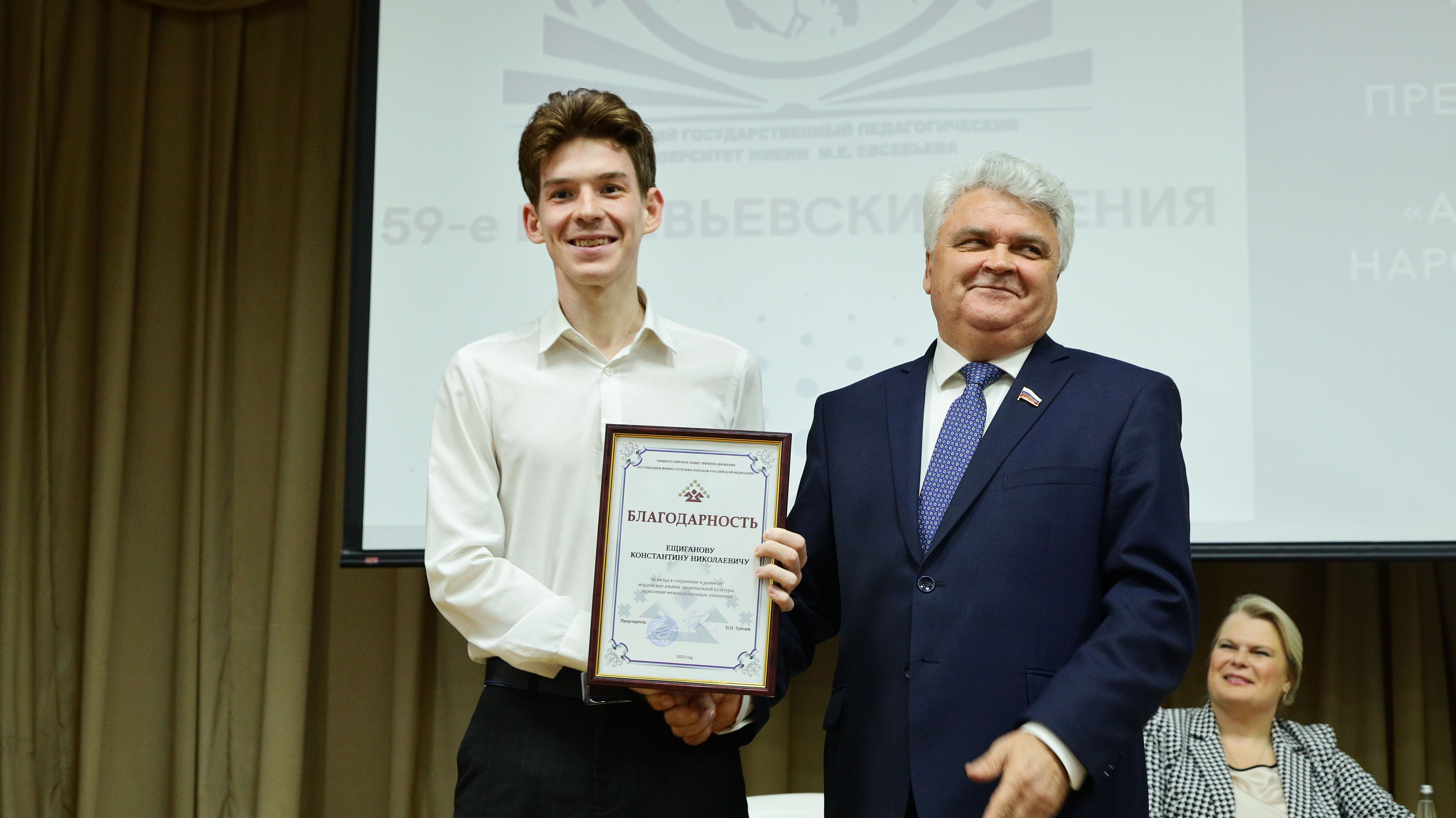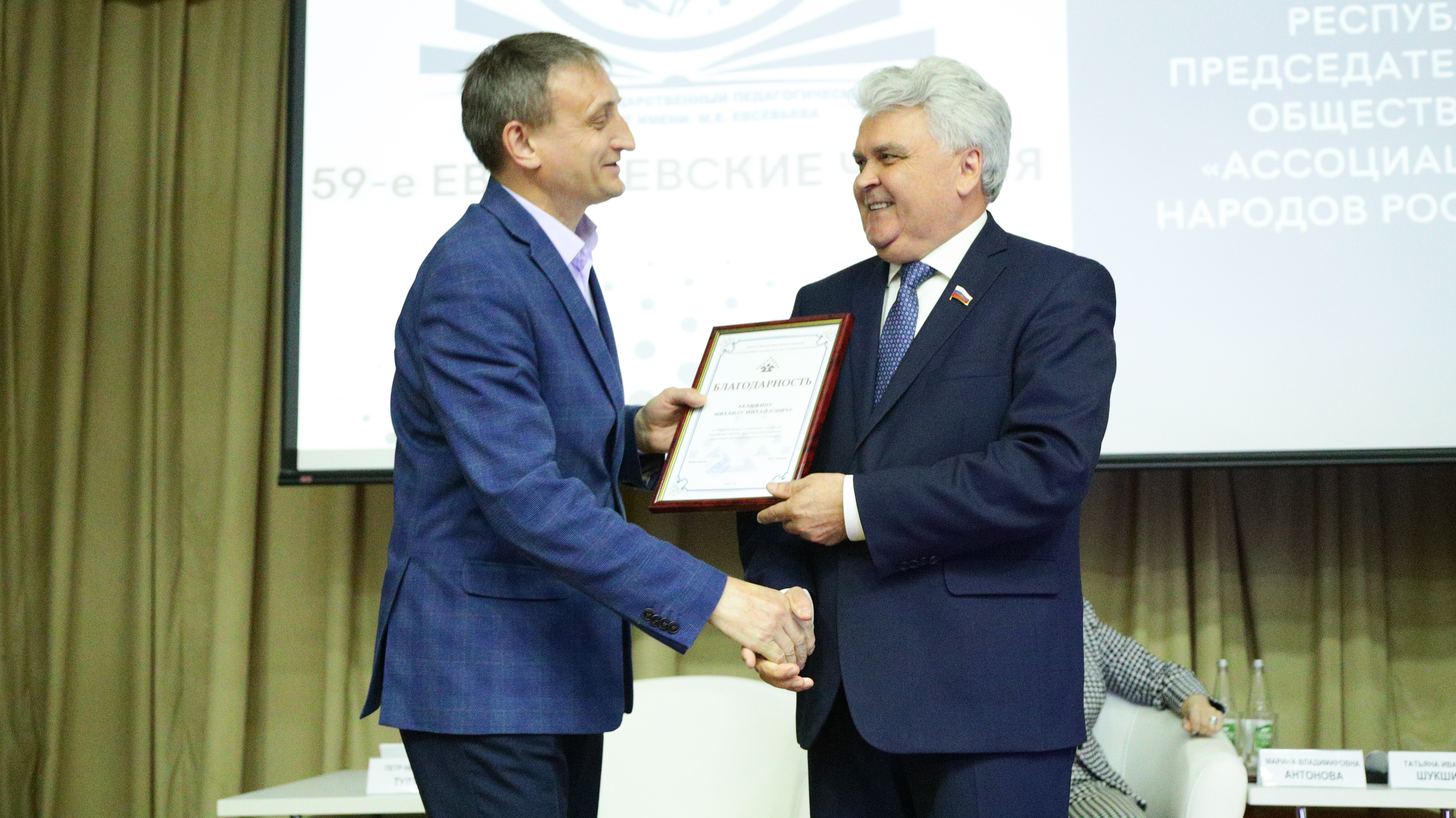 К участникам конференции с приветственным словом обратился Петр Николаевич Тултаев, сенатор Совета федерации Федерального собрания Российской Федерации, Председатель Общероссийского общественного движения «Ассоциация финно-угорских народов Российской Федерации». За большой вклад в сохранение и развитие мордовских языков, национальной культуры, укрепление межнациональных отношений Благодарностью Председателя Общероссийского общественного движения «Ассоциация финно-угорских народов Российской Федерации» были отмечены: