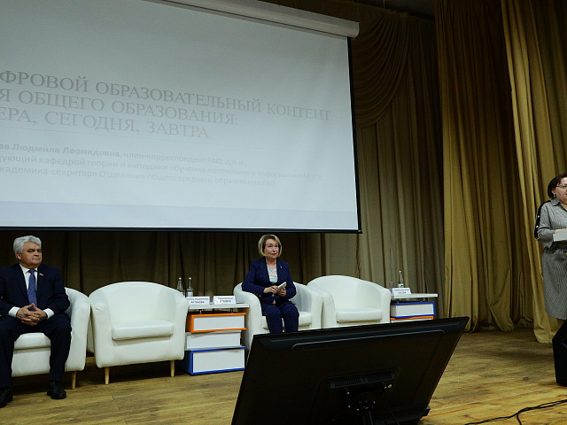 «Цифровой образовательный контент для общего образования: вчера, сегодня, завтра» (докладчик – Босова Людмила Леонидовна, доктор педагогических наук, член-корреспондент РАО, и. о. академика-секретаря Отделения общего среднего образования РАО, заведующая кафедрой теории и методики обучения математике и информатике Московского педагогического государственного университета, г. Москва);