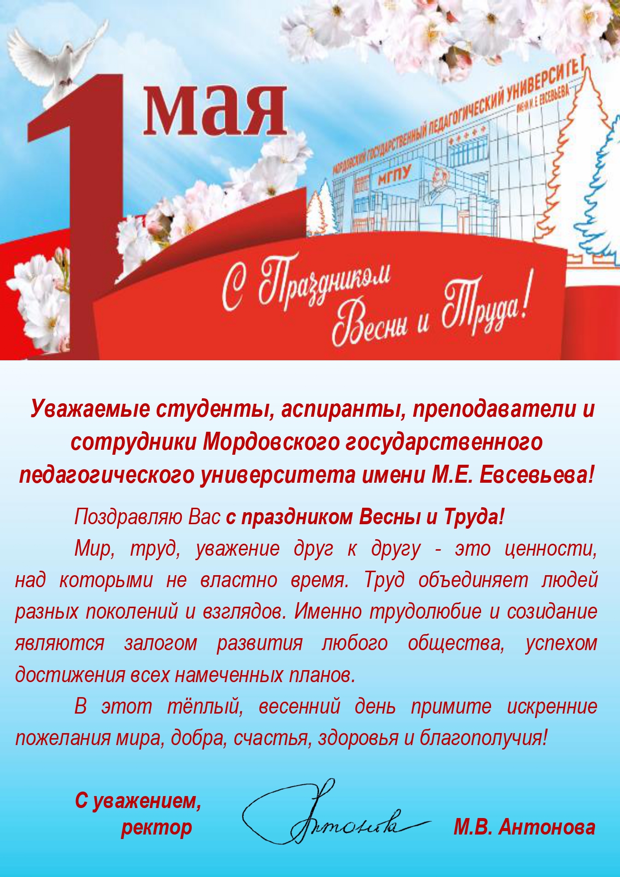 ПОЗДРАВЛЕНИЕ РЕКТОРА МОРДОВСКОГО ГОСУДАРСТВЕННОГО ПЕДАГОГИЧЕСКОГО УНИВЕРСИТЕТА ИМЕНИ М. Е. ЕВСЕВЬЕВА МАРИНЫ ВЛАДИМИРОВНЫ АНТОНОВОЙ С ПРАЗДНИКОМ ВЕСНЫ И ТРУДА