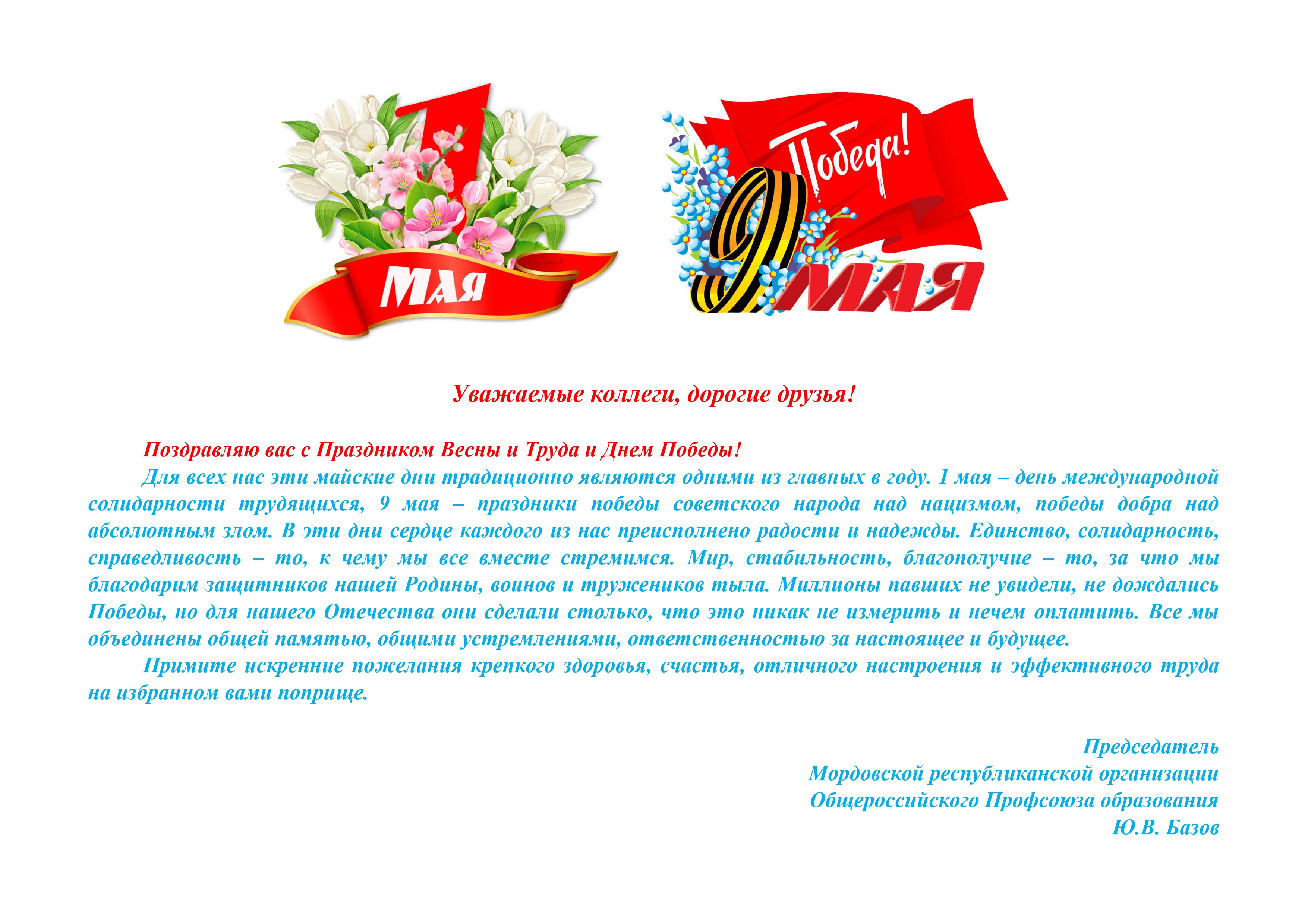 Поздравление председателя Мордовской республиканской организации Общероссийского Профсоюза образования Ю.В. Базова с Праздником Весны и Труда и Днем Победы!