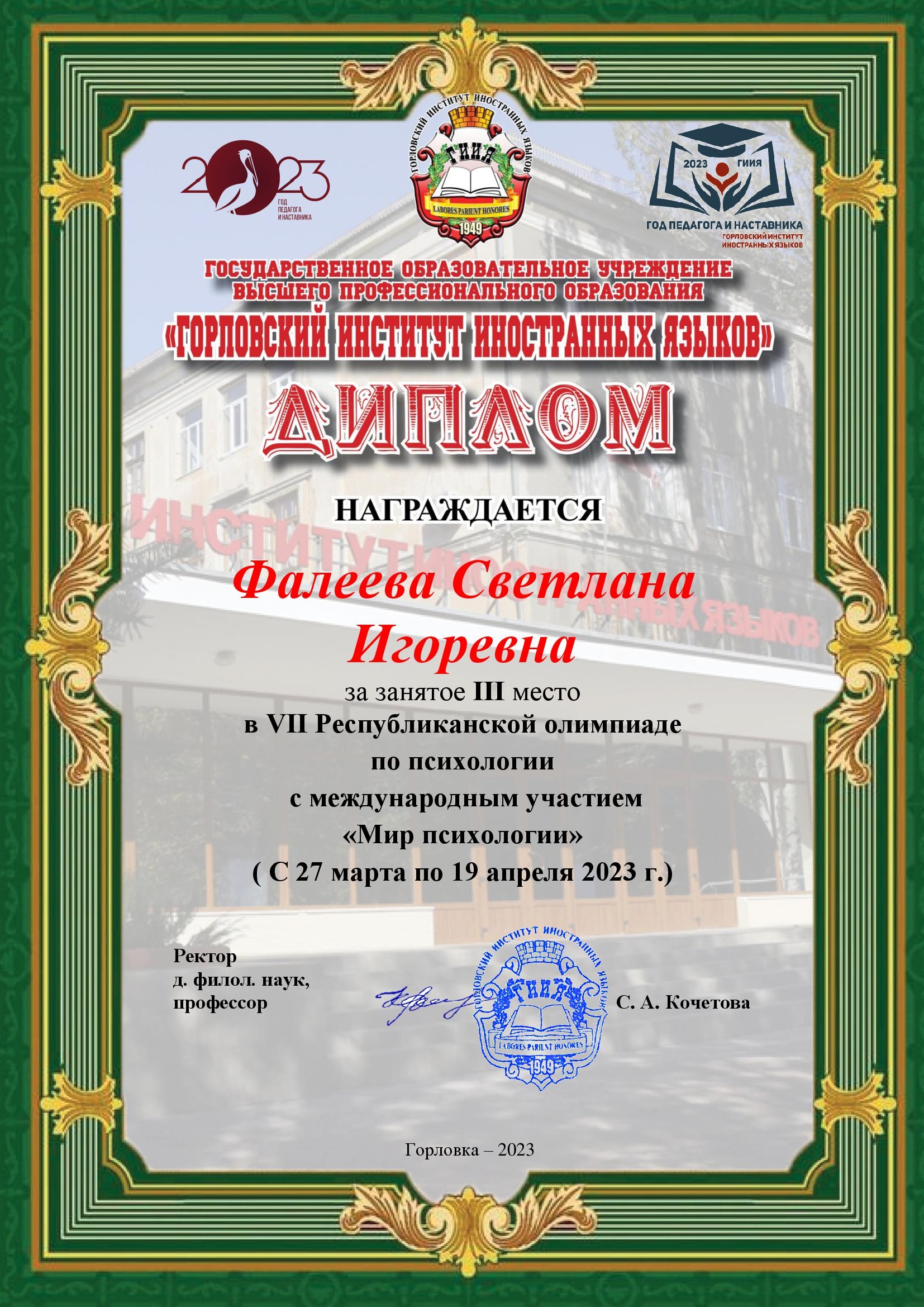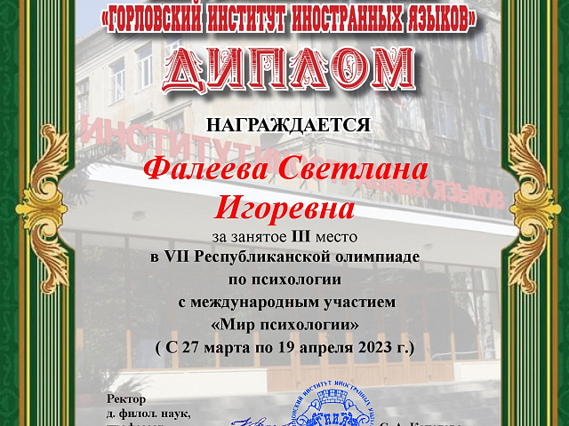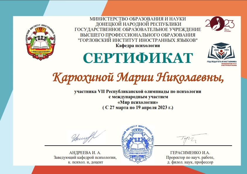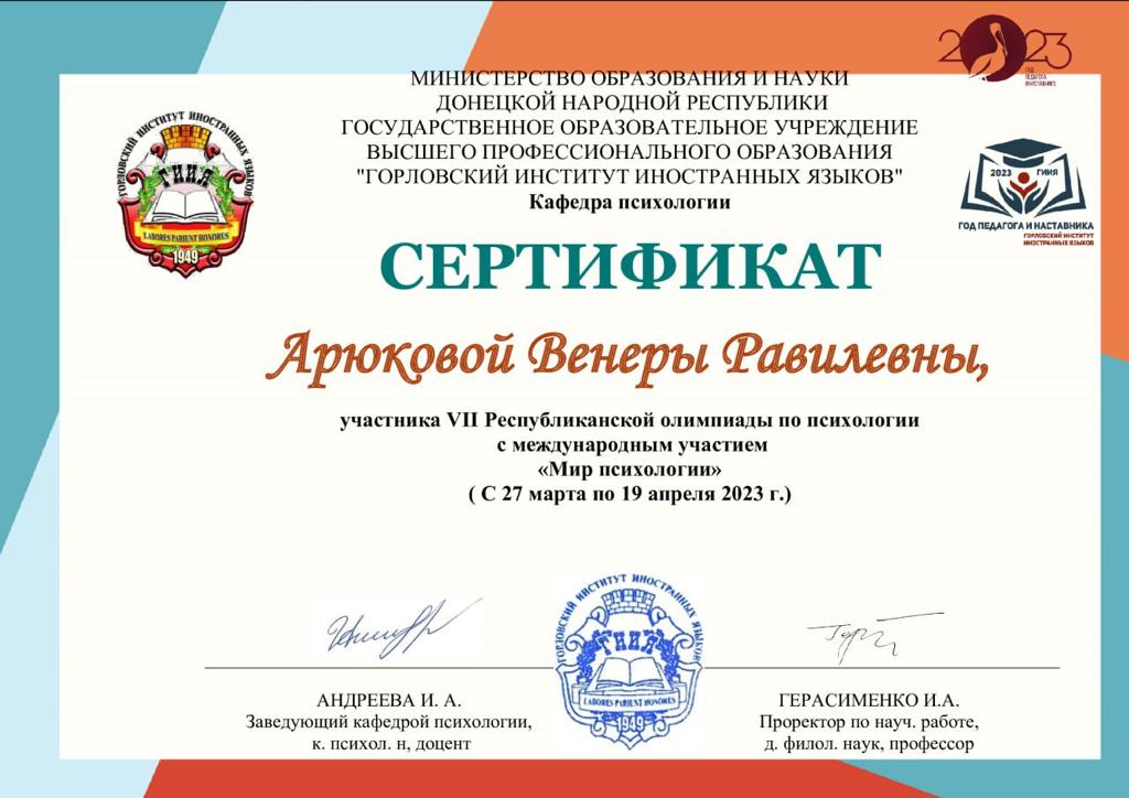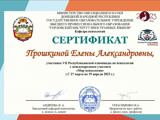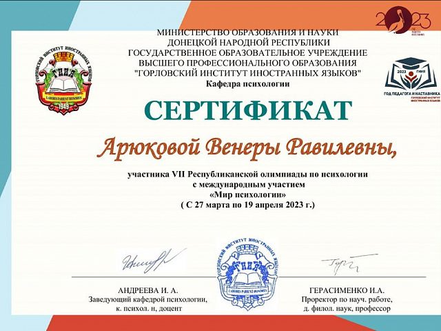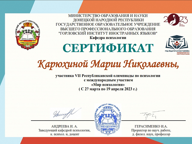 Студенты-психологи Мордовского государственного педагогического университета имени М. Е. Евсевьева своим участием поддержали Горловский институт иностранных языков Донецкой народной республики в VII Республиканской олимпиаде по психологии с международным участием «Мир психологии», которая проходила с 27 марта по 19 апреля 2023 года.