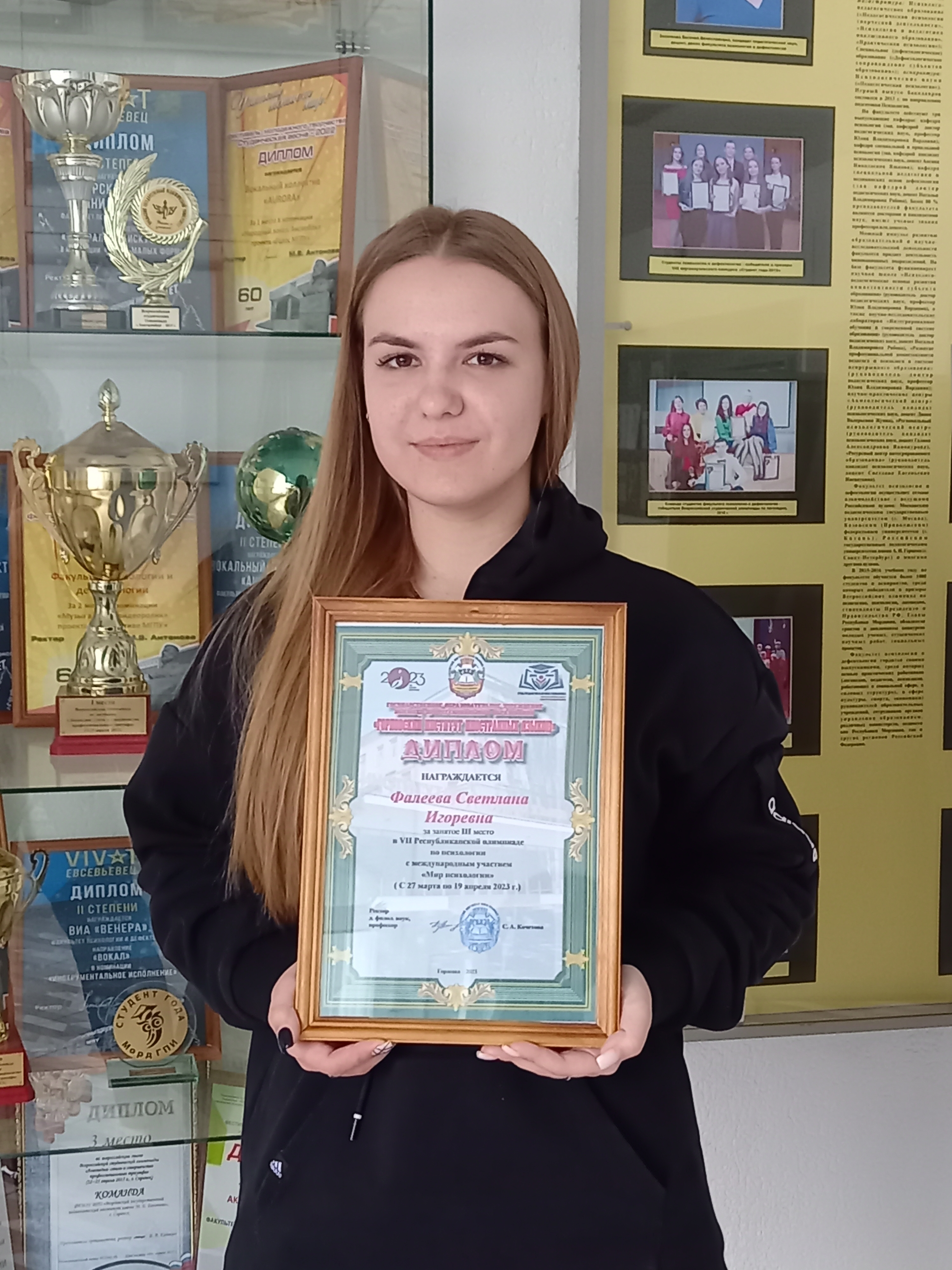 Организаторы Олимпиады отметили призовым местом в индивидуальном первенстве студентку 4 курса факультета психологии и дефектологии Фалееву Светлану Игоревну, которая достойно представила уровень научной и практической подготовки по профилю «Психология» МГПУ.