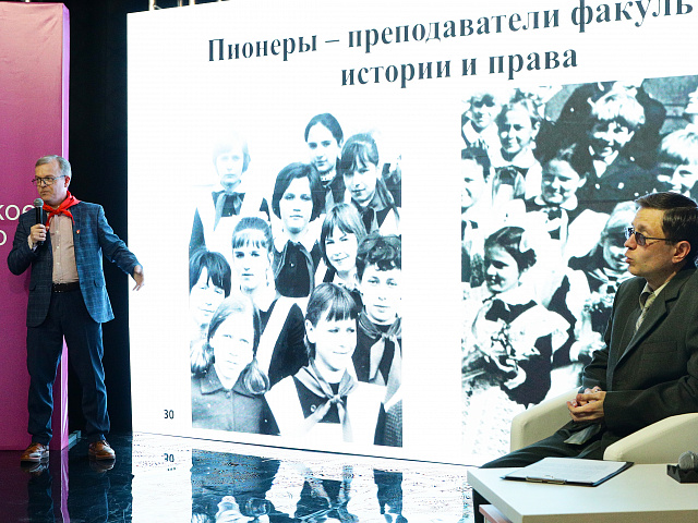 Т.Д. Надькин подробно рассказал о создании и развитии пионерской организации, которая в советское время являлась уникальным объединением школьников от 10 до 14 лет, внесшим большой вклад не только в гражданского-патриотическое воспитание, но и в укрепление физического здоровья подрастающего поколения. Наш университет является кузницей кадров для педагогических отрядов России и для студентов, несомненно, интересным было узнать о законах и традициях пионерской организации, о трудовом и военном подвиге мальчишек и девчонок, о замечательных пионерских лагерях всесоюзного и международного значения («Артек», «Орденок» и др.).