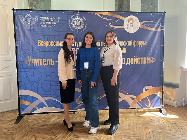 Командой студентов нашего университета в составе: Ляпиной Виктории, Тараскиной Ольги и Хрюкиной Надежды под руководство Марины Антоновой был подготовлен социально-педагогический проект в номинации «Практика наставничества: взаимодействие «студент – ученик» в профориентации школьников», который высоко оценен экспертным сообществом и удостоен первого места.