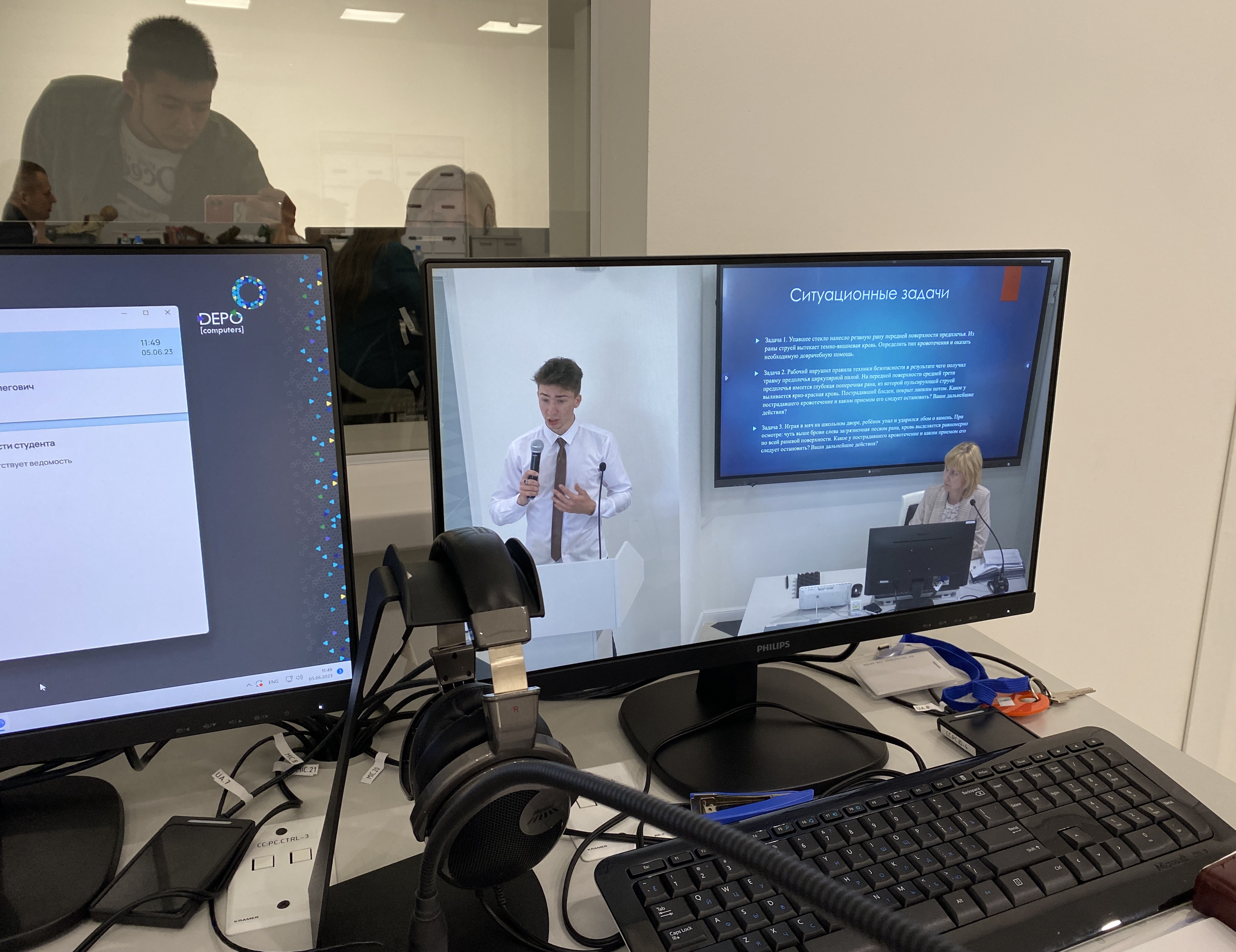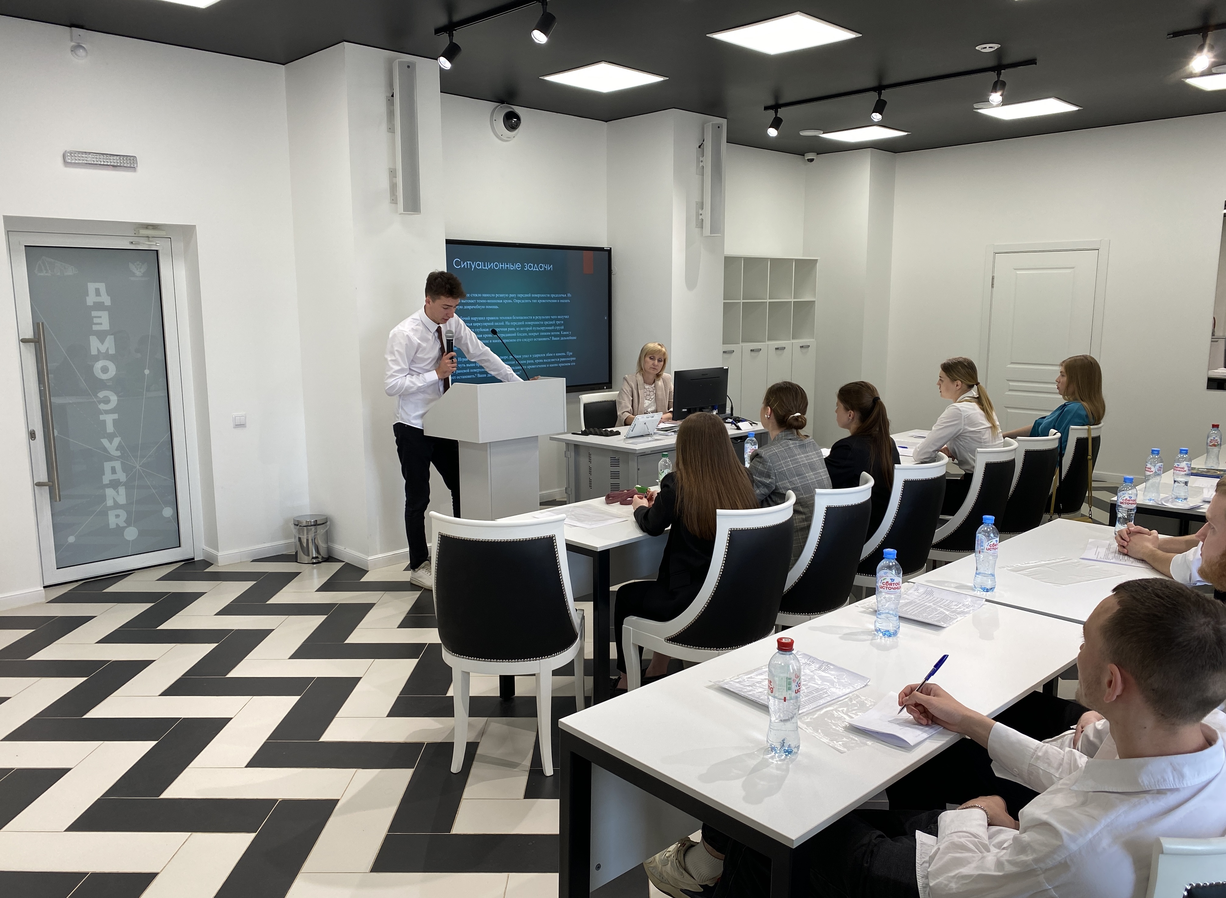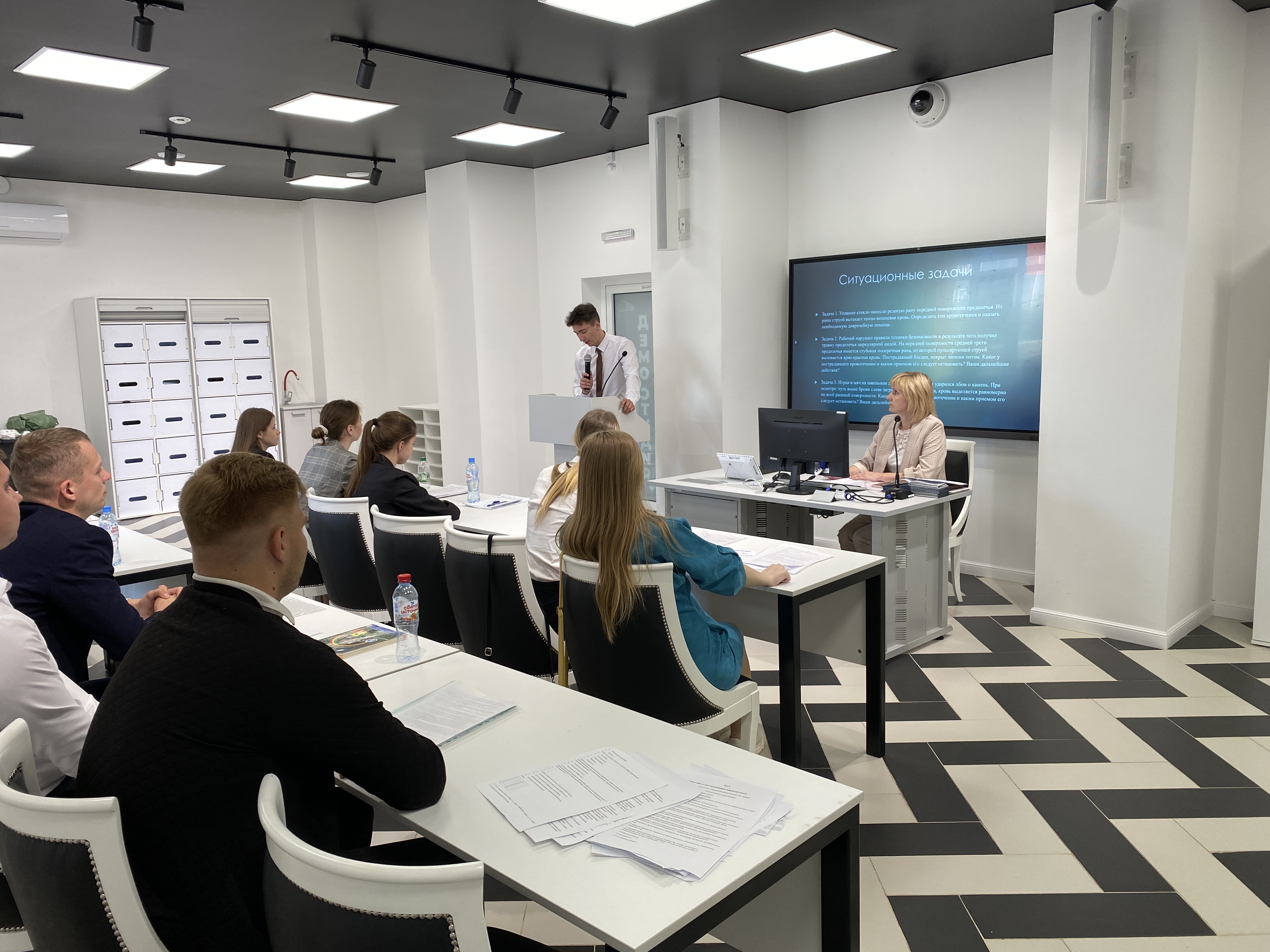 Каждый выпускник представил фрагмент урока по дисциплине «Основы безопасности жизнедеятельности», в рамках которого решались задачи по формированию у обучающихся практических умений и навыков безопасного поведения в условиях повседневной жизни и в экстремальных ситуациях: оказание первой помощи, использование средств индивидуальной защиты, отработка алгоритма действий по обеспечению собственной безопасности и безопасности окружающих людей.