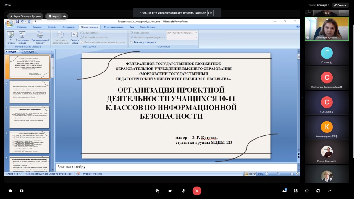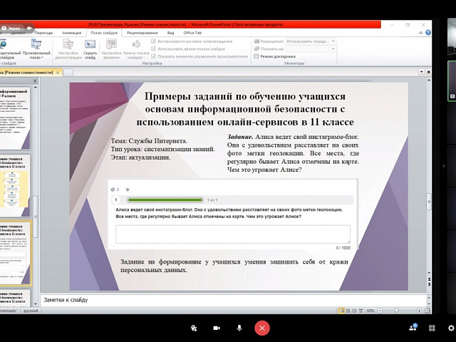 На семинаре поднимались проблемы, касающиеся информационной безопасности сферы образования. С докладами выступили И. А. Яшкова магистрант 1 года обучения, учитель СОШ №39, Кутуева Э.Р., магистрант 1 года обучения, педагог дополнительного образования IT-куб. Докладчики обозначили основные проблемы информационной безопасности в образовании, показали пути их решения. В дискуссии активное участие приняли преподаватели кафедры физики, информационных технологий и методик обучения и присутствующие на семинаре педагоги.