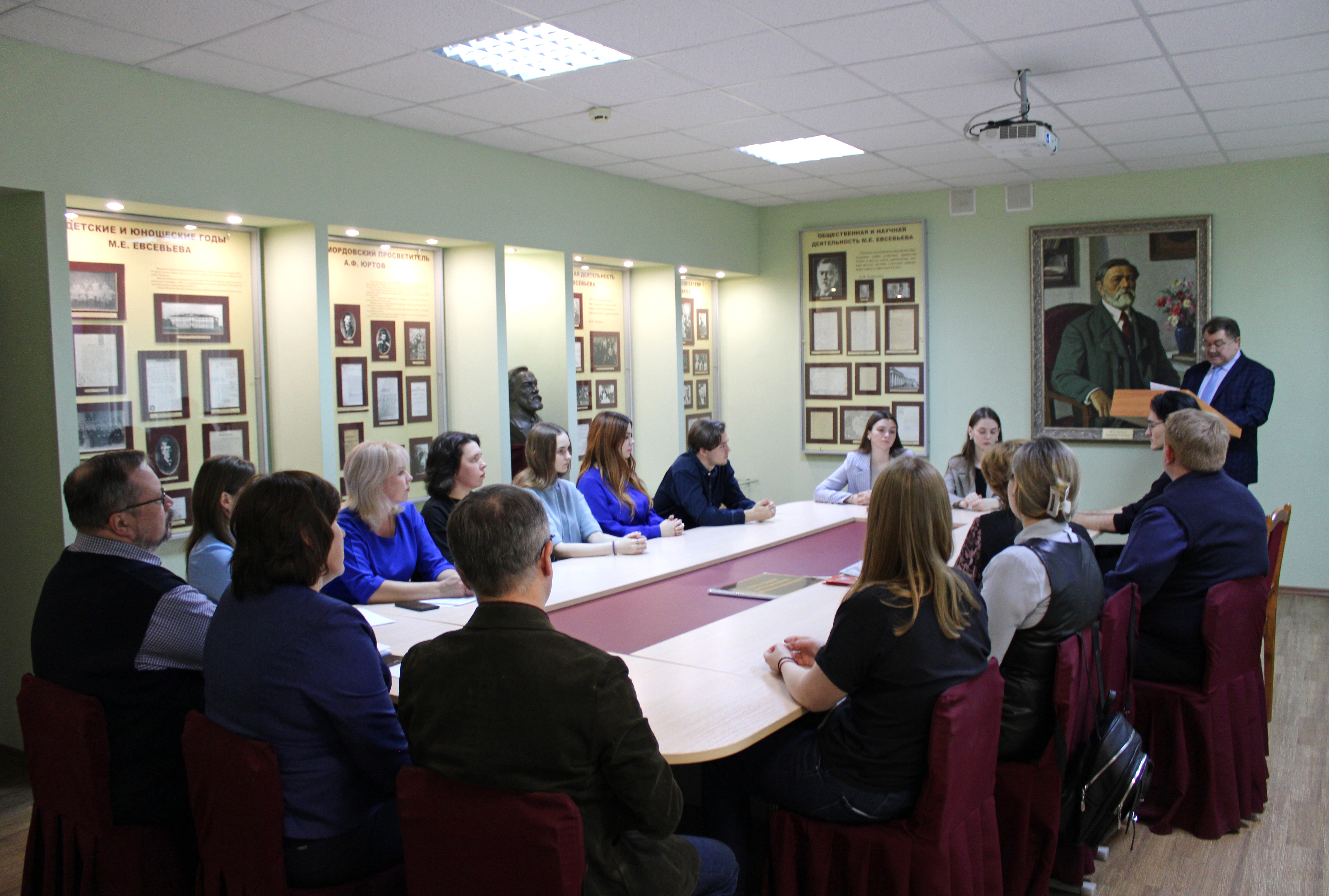 Николай Евгеньевич Горячев, кандидат исторических наук, старший преподаватель кафедры отечественной и зарубежной истории и методики обучения, представил участникам и гостям семинара музейный комплекс, работающий на базе факультета истории и права, обратив внимание на его многофункциональный характер, поскольку музей включает в себя разделы по истории образования, этнографии и археологии.