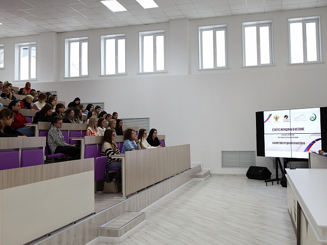 Встреча была посвящена статусу женщины в исламе. Педагог рассказала студентам о проблемах активизации женщин в общественной и культурной жизни общества, укрепления нравственных устоев общества и семьи, повышения роли материнства, уровня образования, воспитания подрастающего поколения.