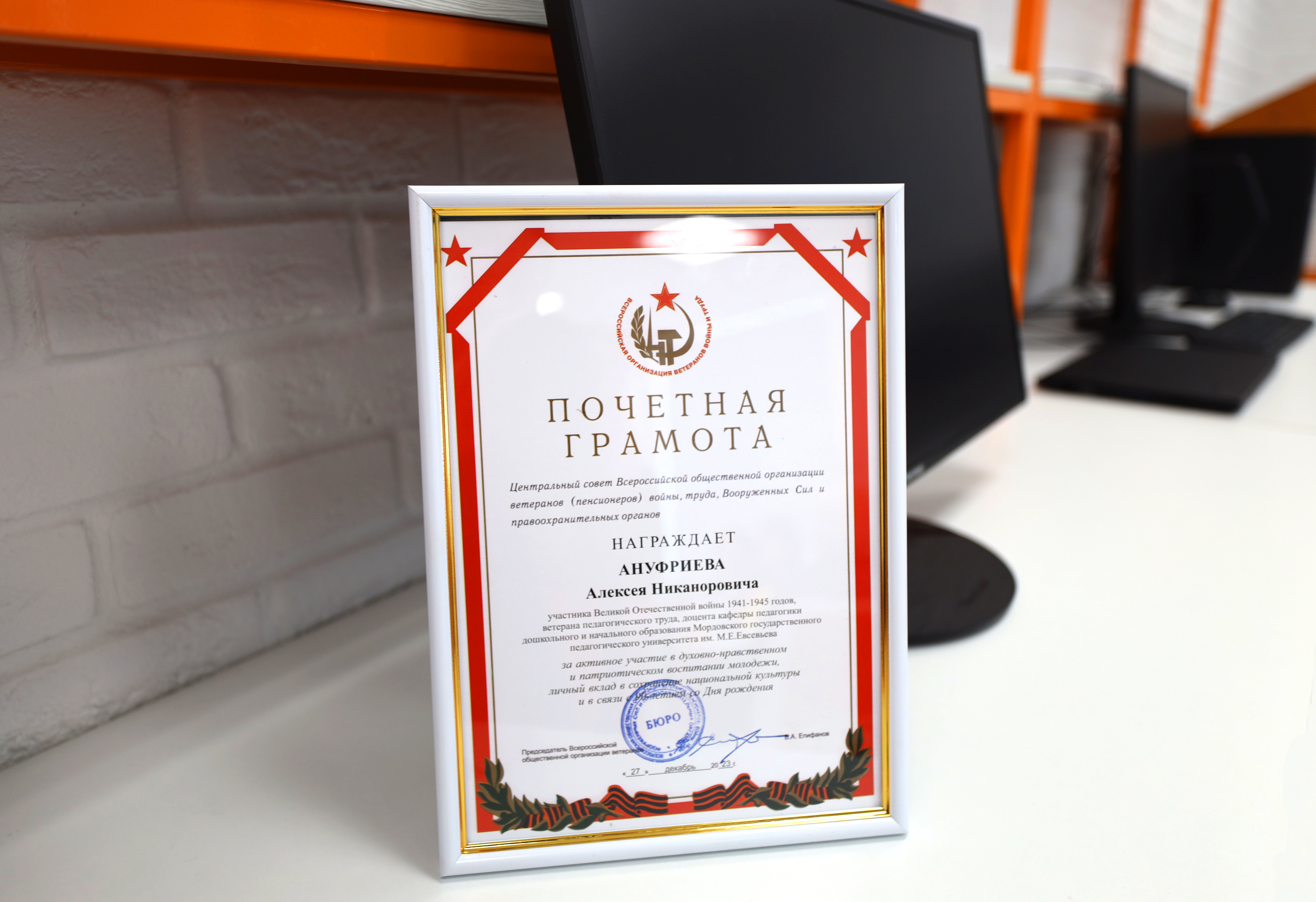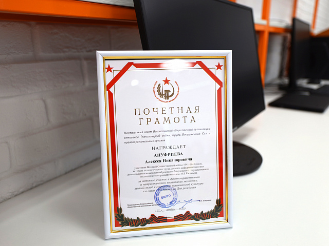 Кроме того, ректор вручила почетную грамоту Центрального совета Всероссийской общественной организации ветеранов (пенсионеров) войны, труда, Вооруженных сил и правоохранительных органов Ануфриеву Алексею Никаноровичу, участнику Великой Отечественной войны 1941-1945 гг., ветерану педагогического труда, доценту кафедры педагогики дошкольного и начального образования МГПУ им. М. Е. Евсевьева за активное участие в духовно-нравственном и патриотическом воспитании молодежи, личный вклад в сохранение национальной культуры и в связи с 90-летием со Дня рождения.
