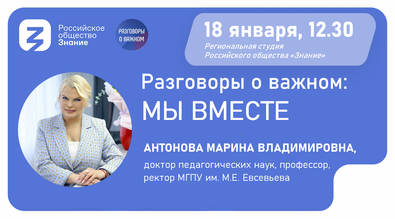 18 января на площадке региональной студии Российского общества «Знание» МГПУ им. М. Е. Евсевьева в рамках дискуссии «Разговоры о важном» состоится встреча-диалог «МЫ ВМЕСТЕ» доктора педагогических наук, профессора, ректора МГПУ им. М. Е. Евсевьева Антоновой Марины Владимировны со студенческим и преподавательским сообществом вуза.