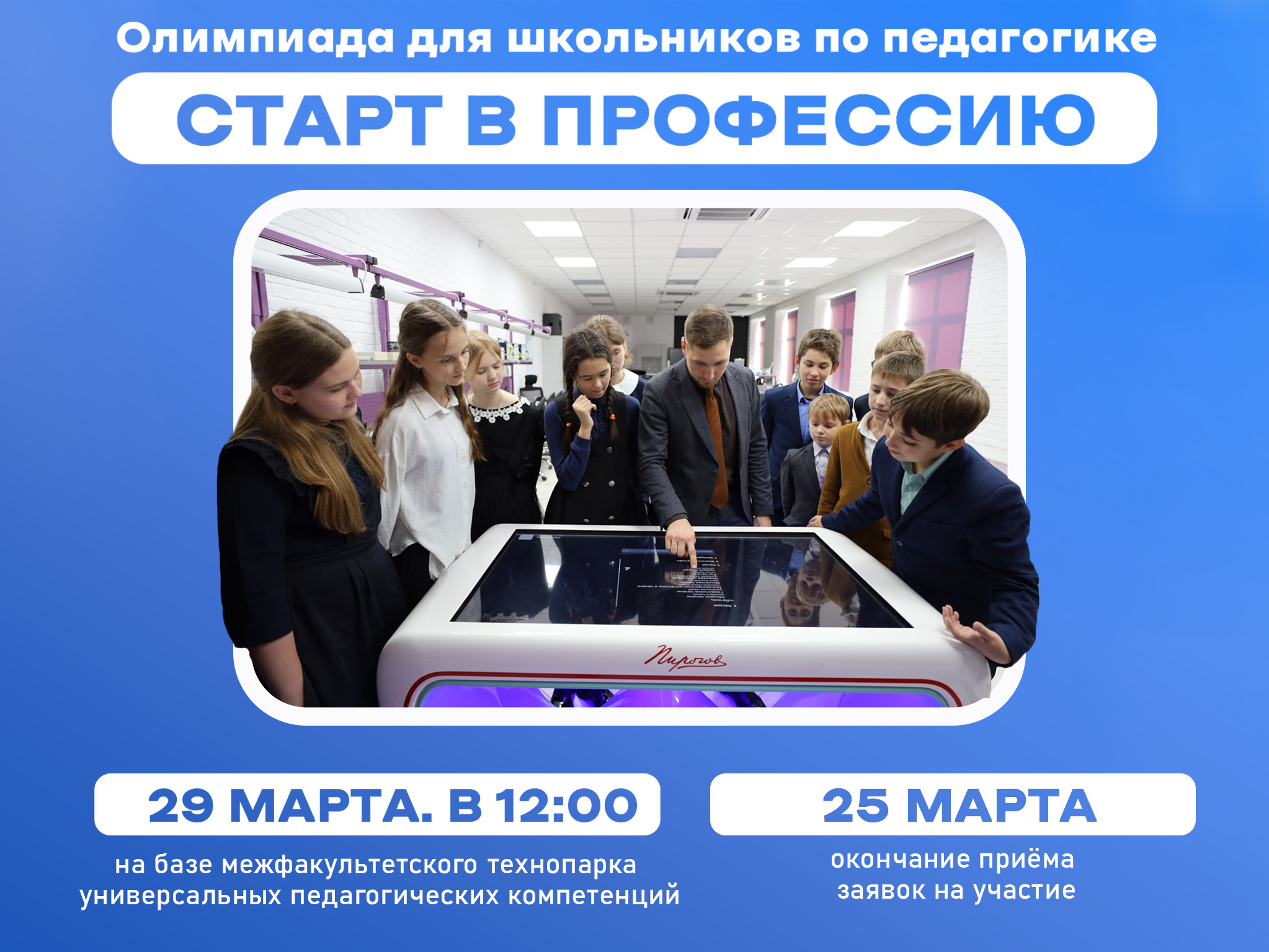 Мероприятие состоится 29 марта 2024 года на базе Межфакультетского технопарка универсальных педагогических компетенций в 12:00.