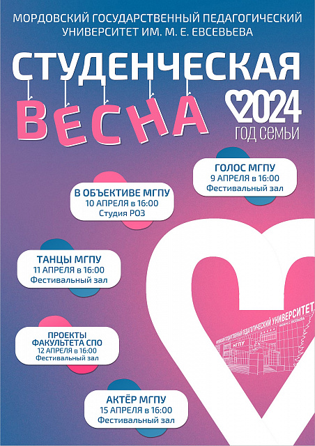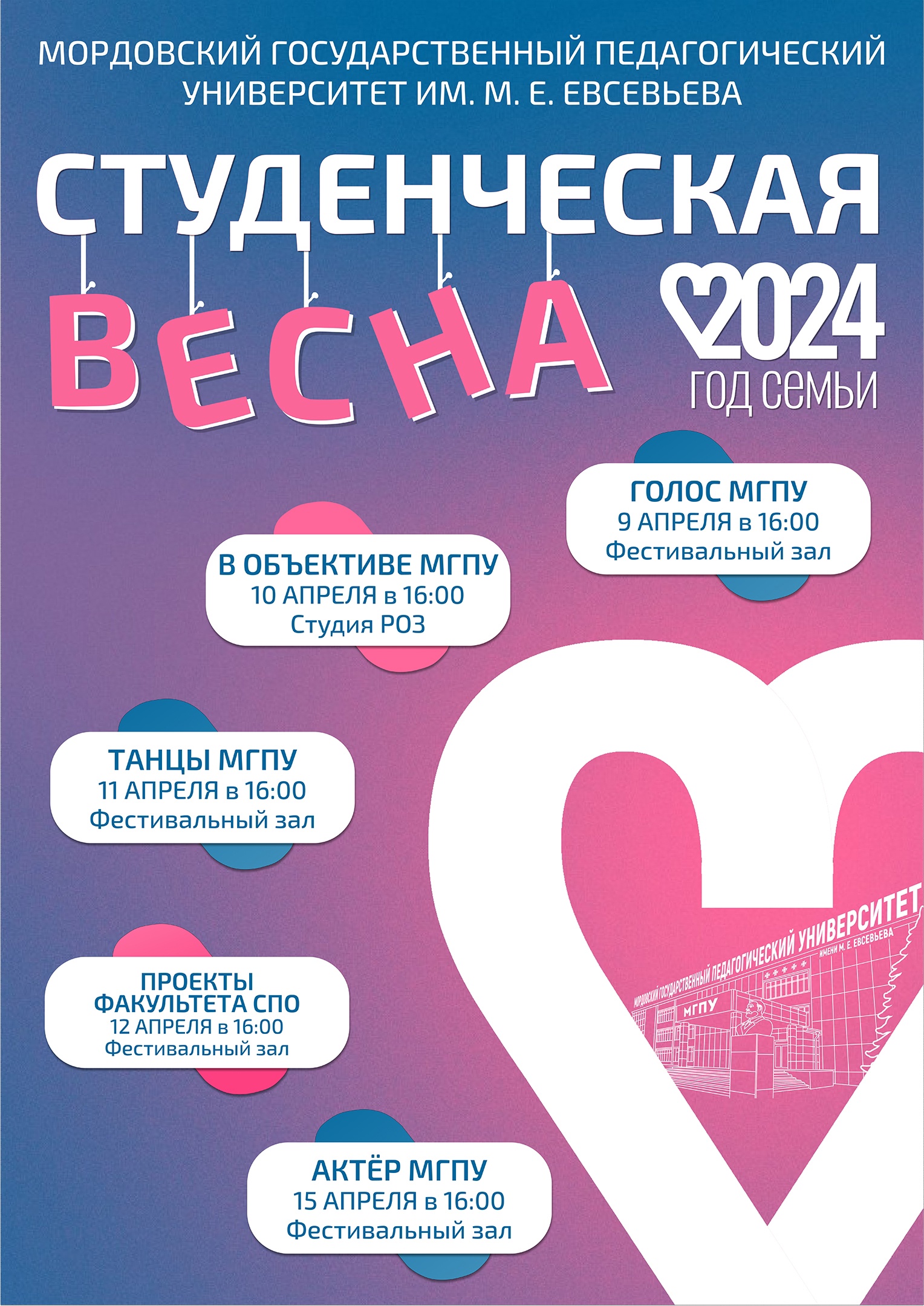 Фестиваль студенческой весны — это уникальная возможность для каждого студента показать свои таланты и проявить себя на сцене. Насладитесь фестивалем энергии, красок и ритма! Яркие номера, захватывающие выступления в разных жанрах — песни, танцы, музыкальные интерпретации и многое другое — все это создаст неповторимую атмосферу праздника, которую невозможно забыть!