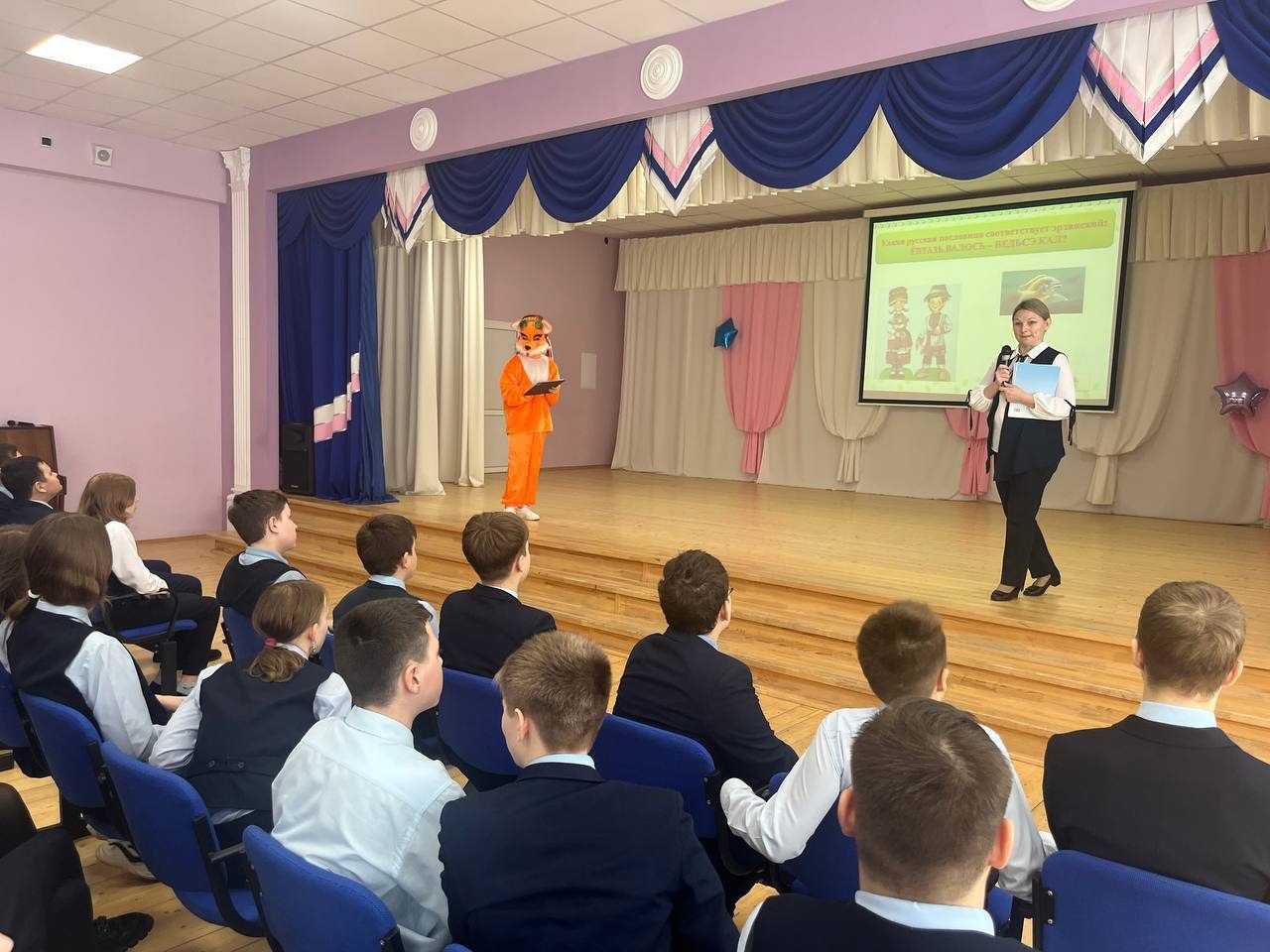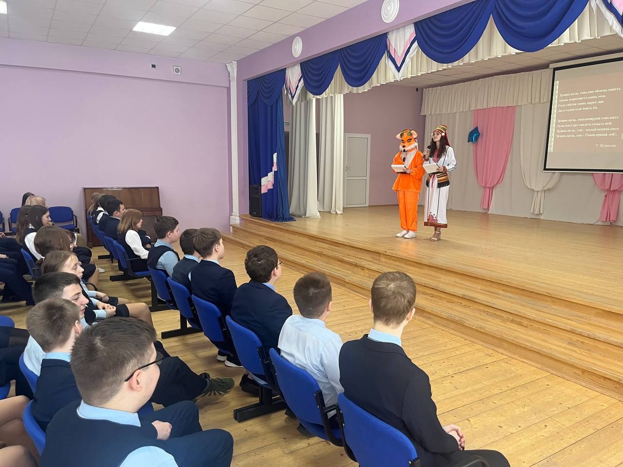 Ведущие Школы мордовских языков Гущина Юлия и Виряскина Анастасия поздравили учащихся с наступающим праздником на национальных языках, прочитали стихи мордовских писателей о родном языке, порассуждали с детьми, каким может быть язык, какова его ценность в жизни каждого. Школьники активно включились в диалог. Кульминацией мероприятия стала интерактивная игра «Знатоки мордовских языков и культуры мордовского народа», в процессе которой учащиеся показали свои знания мордовских языков, проявили свои творческие и интеллектуальные способности.