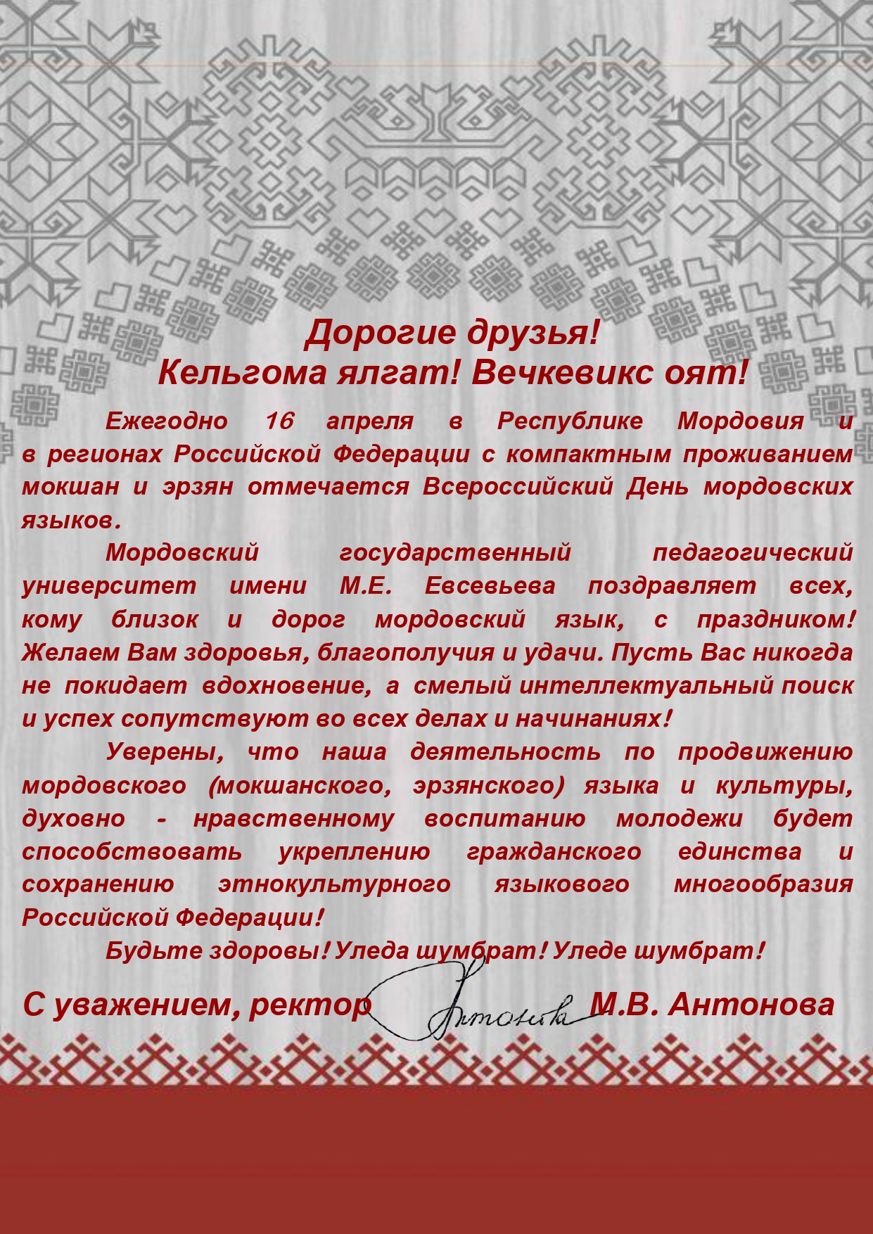 ПОЗДРАВЛЕНИЕ РЕКТОРА МГПУ ИМ. М.Е.ЕВСЕВЬЕВА М.В. АНТОНОВОЙ СО ВСЕРОССИЙСКИМ ДНЕМ МОРДОВСКИХ ЯЗЫКОВ