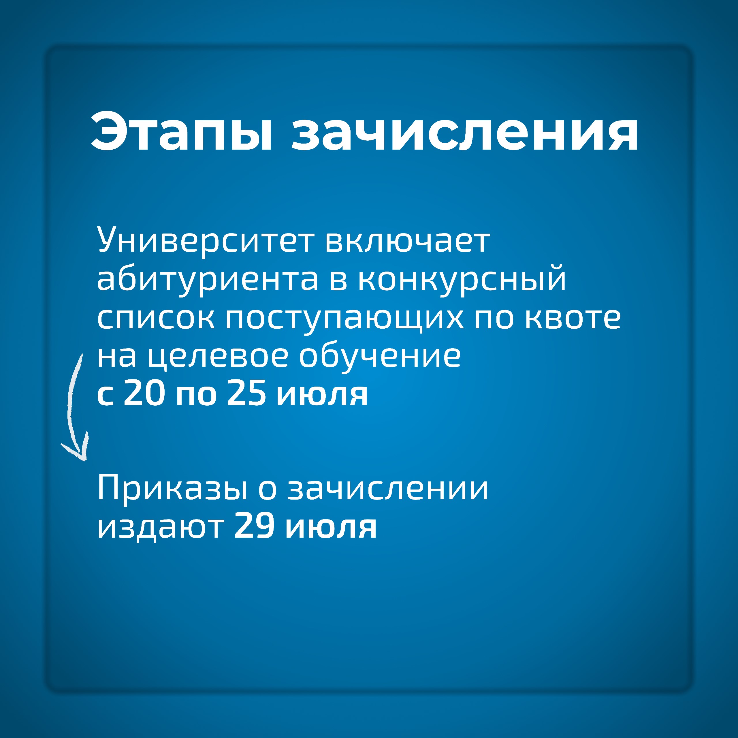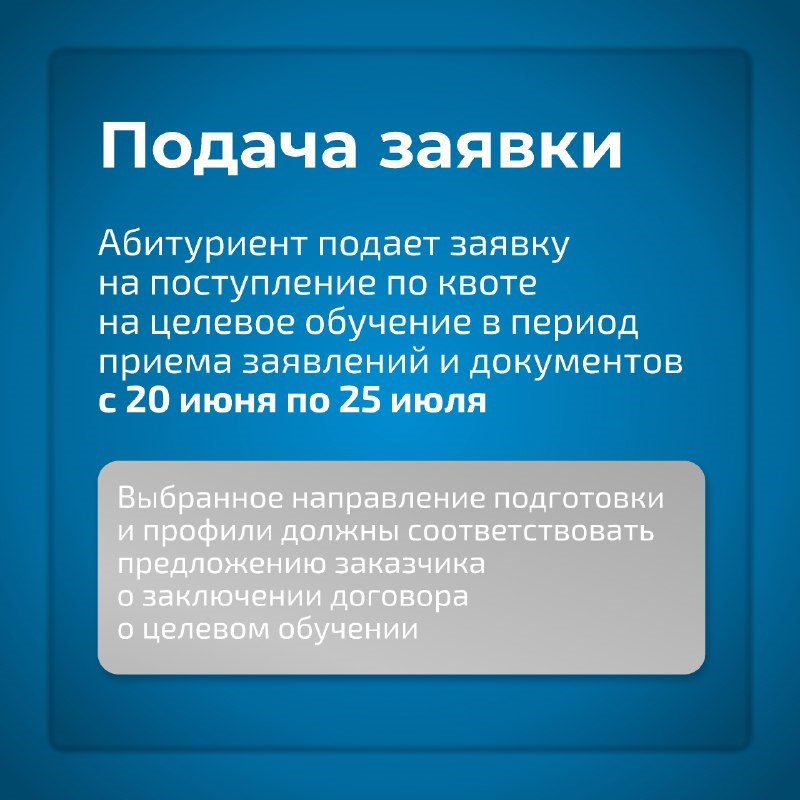 - если гражданин подает заявление о приеме на обучение непосредственно в вуз (лично, по почте или через информационную систему вуза), то он должен самостоятельно ознакомиться с предложениями заказчиков на Единой цифровой платформе в сфере занятости и трудовых отношений «Работа в России» и подать заявку на заключение договора о целевом обучении в вуз в период приема заявлений о приеме на обучение, то есть с 20 июня до 20-25 июля.