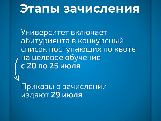 Поступление на места в пределах целевой квоты – это особый формат приема в вуз, который позволяет поступить на обучение по отдельному конкурсу. Гражданин должен изучить полный перечень предложений, которые будут опубликованы заказчиками в сети Интернет на Единой цифровой платформе в сфере занятости и трудовых отношений «Работа в России», выбрать предложение, которое наиболее соответствует его пожеланиям, и подать заявку на заключение договора о целевом обучении в соответствии с этим предложением.