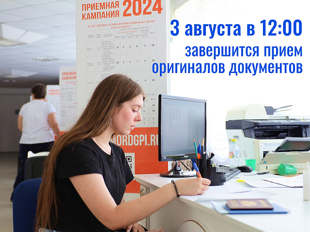 Приемная комиссия МГПУ им. М.Е. Евсевьева напоминает, что 3 августа 2024 г. в 12.00 завершается прием оригиналов документов об образовании или выставление отметок об оригинале на портале «Госуслуги» от лиц, поступающих в университет на бюджетные места на основном этапе! Не забудьте своевременно предоставить оригинал аттестата или диплома, чтобы быть зачисленным в вуз!