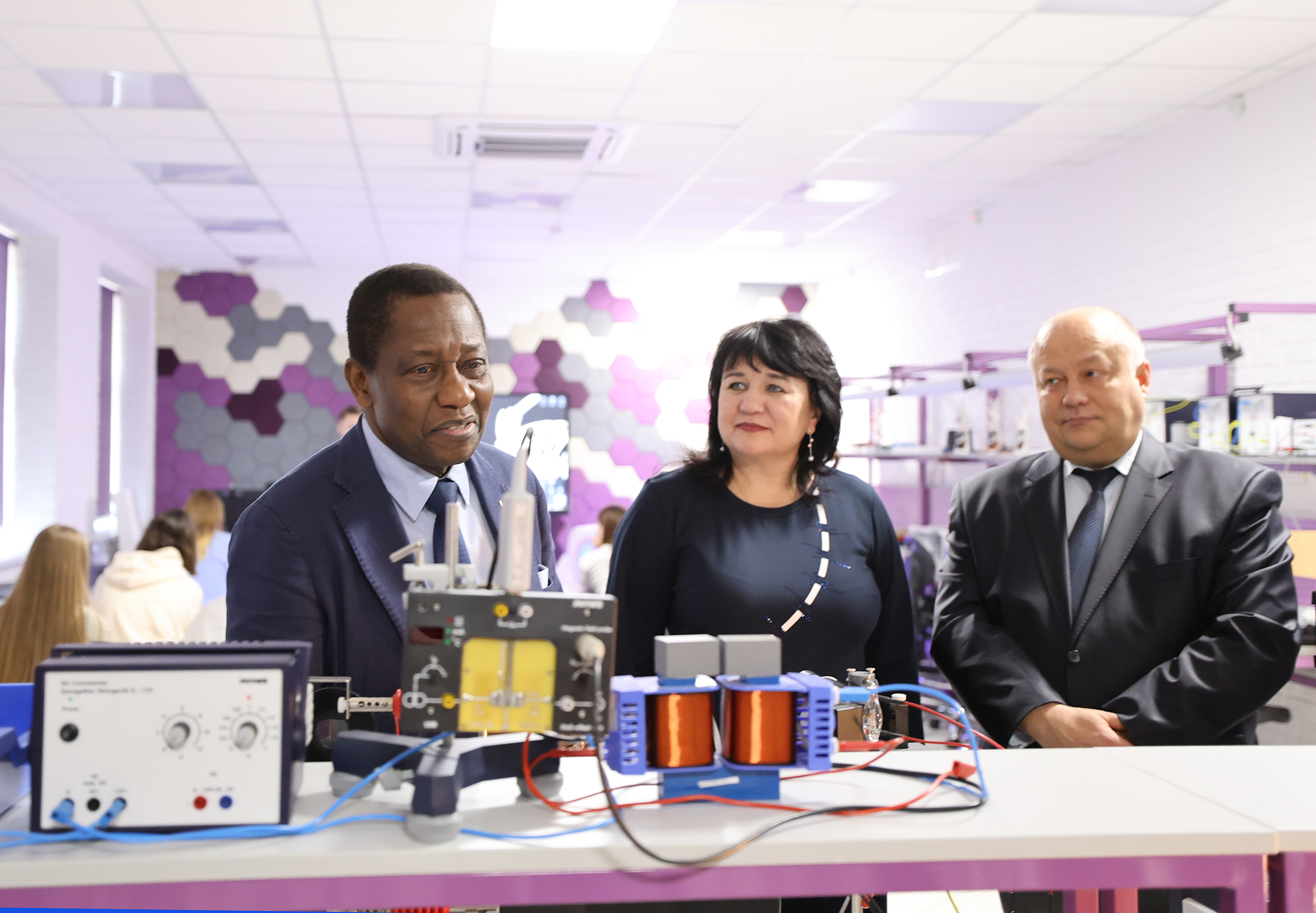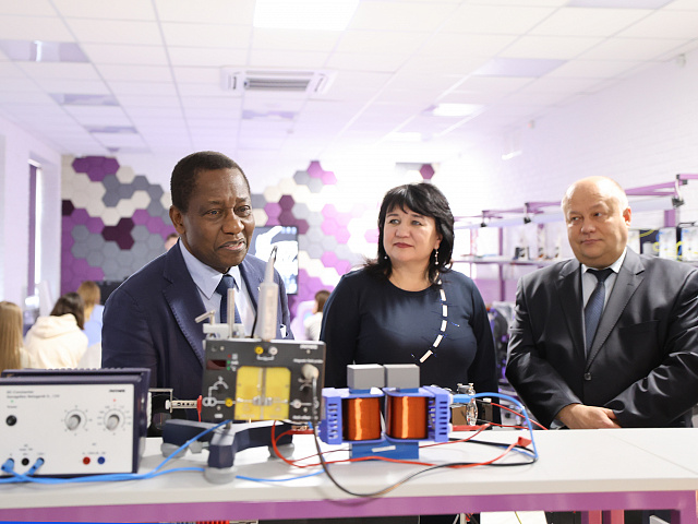 На площадке медиалаборатории Кванториума гости приняли участие в съемках мастер-класса для онлайн Школы мордовских языков. Вместе с ведущими Железняковой Кристиной, Ильиным Леонидом и сказочными персонажами школы – Куйгорож и Лисичка – они учили «вежливые» слова и выражения на мокшанском языке, а Анисет Габриэль Кочофа, посол российского образования и науки (Бенин), поздравил всех слушателей Школы мордовских языков и студентов вуза с предстоящим Международным днем студентов на двух языках – русском и родном (Па’а).