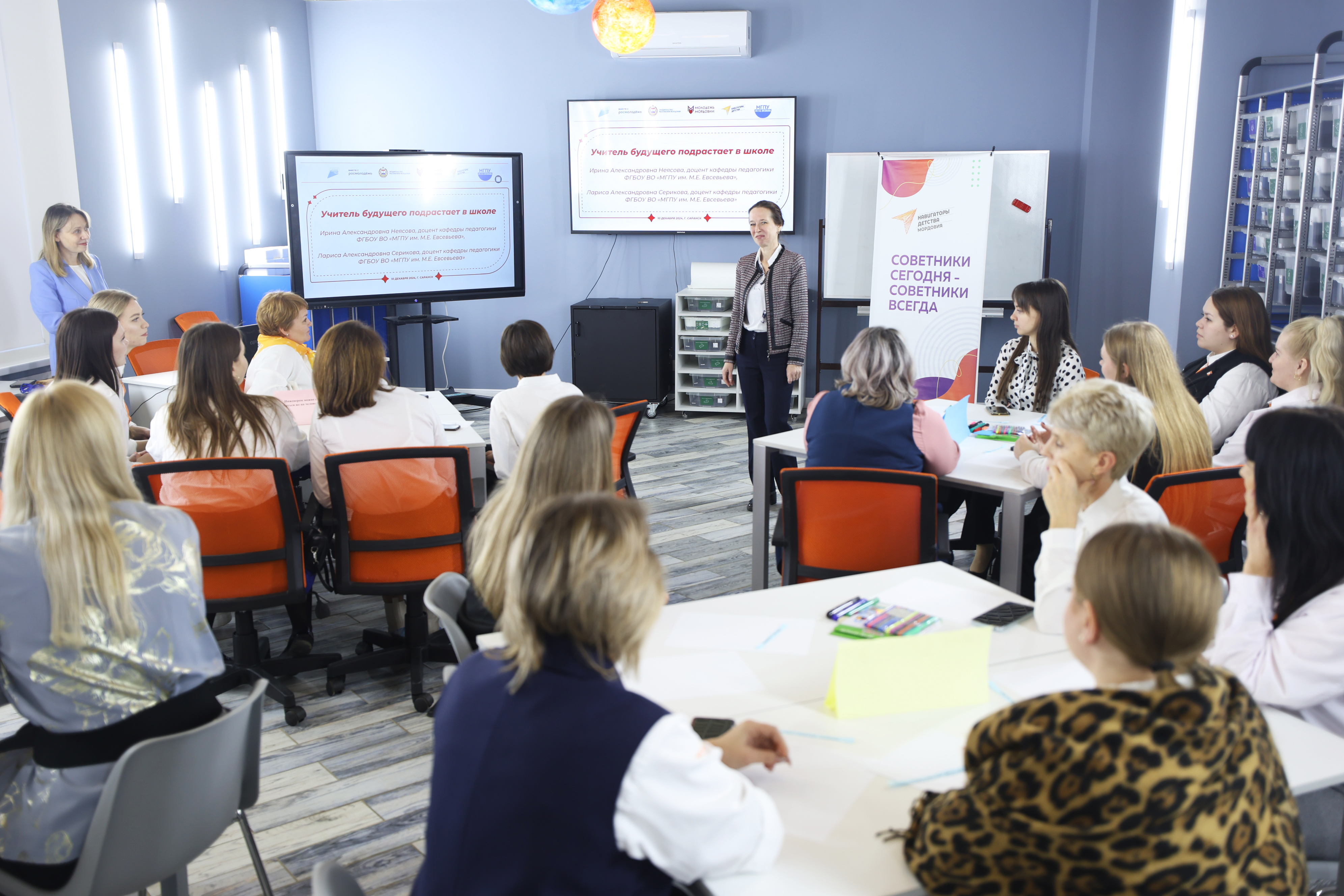 Проектная мастерская «Учитель будущего подрастает в школе» была организована специально для советников директоров по воспитанию и взаимодействию с детскими общественными объединениями, работающих с детьми профильных психолого-педагогических классов в образовательных организациях Республики Мордовия. Ведущими модераторами площадки выступили кандидаты педагогических наук, доценты кафедры педагогики Мордовского государственного педагогического университета имени М. Е. Евсевьева — Лариса Александровна Серикова и Ирина Анатольевна Неясова.