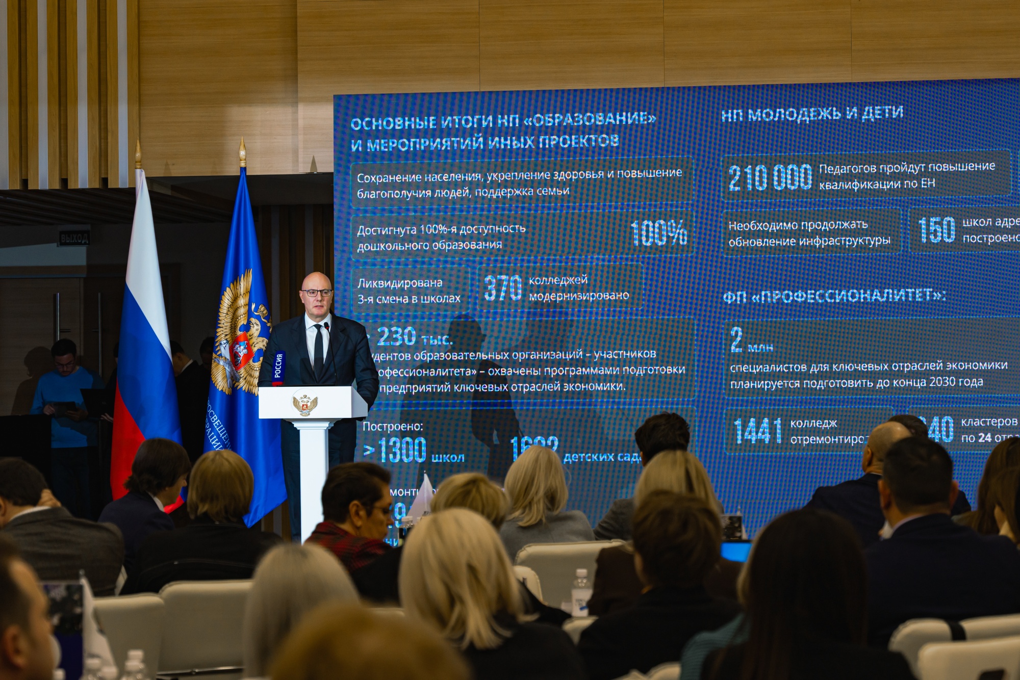 «Мы будем системно развивать математические и естественные науки, планируя повышение квалификации 210 тысяч педагогов. По инициативе Президента Владимира Путина создается сеть из 12 флагманских школ с применением современных технологий. Будет продолжено обновление инфраструктуры – адресное строительство 150 школ и ремонт более 11 тысяч существующих. До 2030 года мы должны также подготовить 2 миллиона специалистов для ключевых отраслей экономики, создав более 500 образовательных кластеров и отремонтировав порядка 1400 колледжей», – сказал Дмитрий Чернышенко.