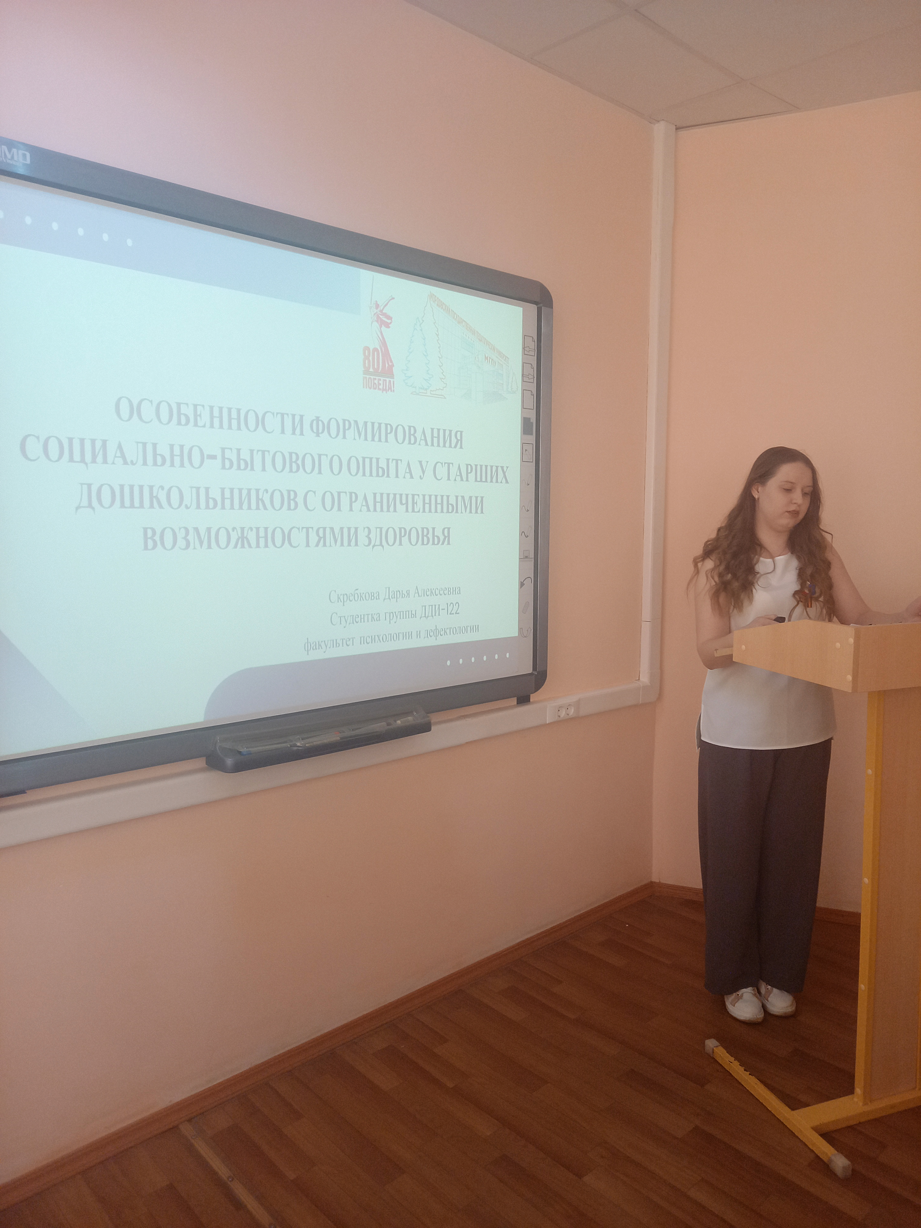 6) «Особенности формирования социально-бытового опыта у старших дошкольников с ограниченными возможностями здоровья» Скребковой Дарьи Алексеевны, студентки Мордовского государственного педагогического университета имени М. Е. Евсевьева.