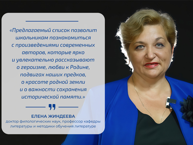 «Инициатива Минпросвещения по формированию списка патриотической литературы для внеклассного чтения является своевременной и крайне важной», – подчеркивает Елена Жиндеева, доктор филологических наук, профессор кафедры литературы и методики обучения литературе. - Литература всегда играла ключевую роль в формировании мировоззрения, духовных ценностей и патриотических чувств у молодежи. Предлагаемый список позволит школьникам познакомиться с произведениями современных авторов, которые ярко и увлекательно рассказывают о героизме, любви к Родине, подвигах наших предков, о красоте родной земли и о важности сохранения исторической памяти. При этом важно, что список структурирован по возрастным категориям, что облегчает выбор литературы, соответствующей уровню восприятия и интересам школьников разного возраста. Задача учителей и библиотекарей – помочь детям сделать правильный выбор и организовать интересные обсуждения прочитанных книг».