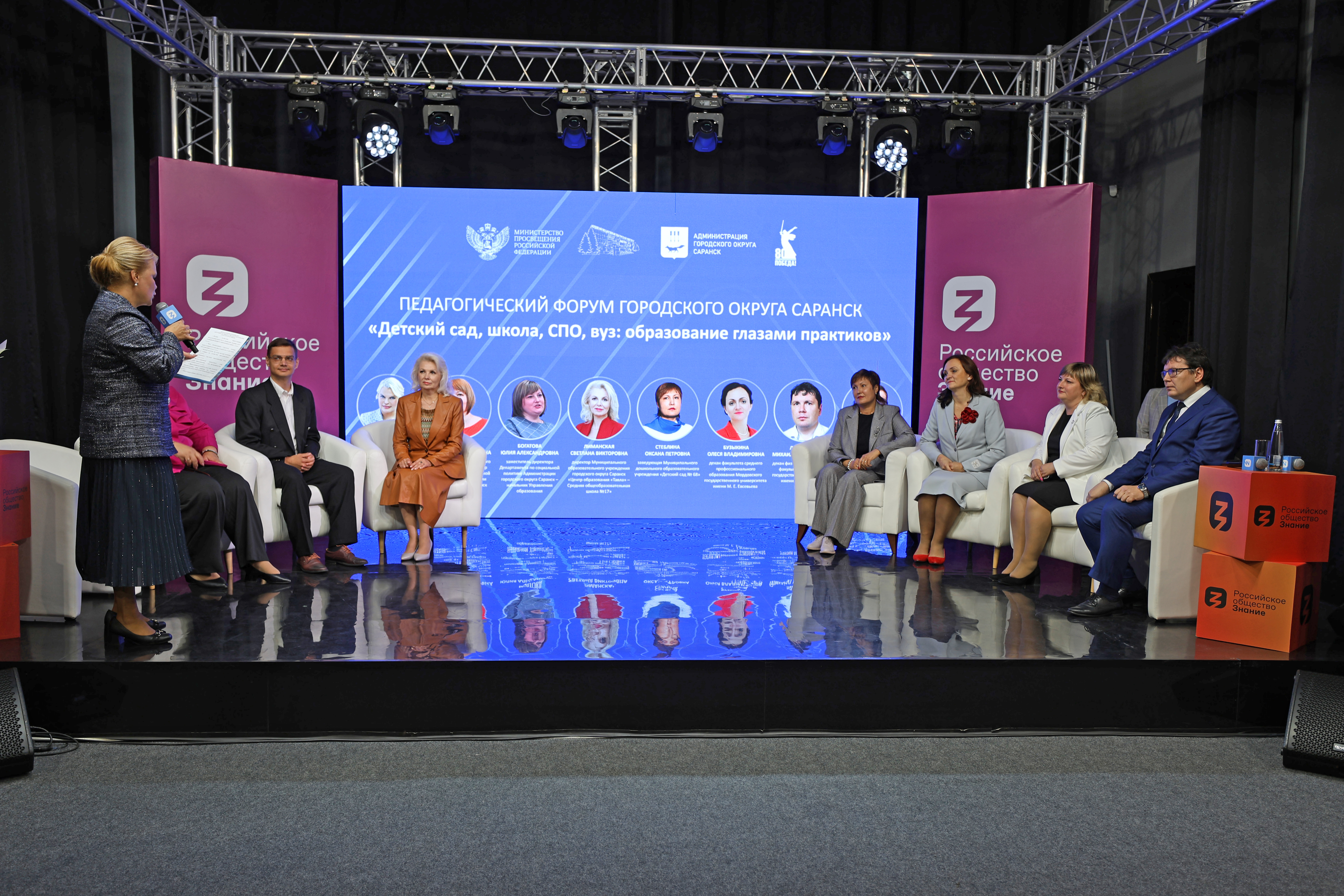 Спикерами полилога с аудиторией стали: ректор Мордовского государственного педагогического университета М. Е. Евсевьева, доктор педагогических наук, профессор РАО Марина Владимировна Антонова, заместитель главы городского округа Саранск – директор Департамента по социальной политике Администрации г.о. Саранск Оксана Владимировна Шуляпова, заместитель директора Департамента по социальной политике Администрации Саранска - начальник управления образования Юлия Александровна Богатова, директор Центра образования «Тавла» - СОШ №17 Светлана Викторовна Лиманская, заведующий детским садом №18 Оксана Петровна Стеблина, декан факультета среднего профессионального образования МГПУ им.М. Е. Евсевьева Олеся Владимировна Бузыкина, декан физико-математического факультета нашего педагогического вуза Михаил Владимирович Ладошкин, учитель информатики СОШ №22 Саранска, магистрант 2 курса направления подготовки «Педагогическое образование» профиля «Педагогика высшей школы» МГПУ им. М. Е. Евсевьева Юрий Алексеевич Балясников.