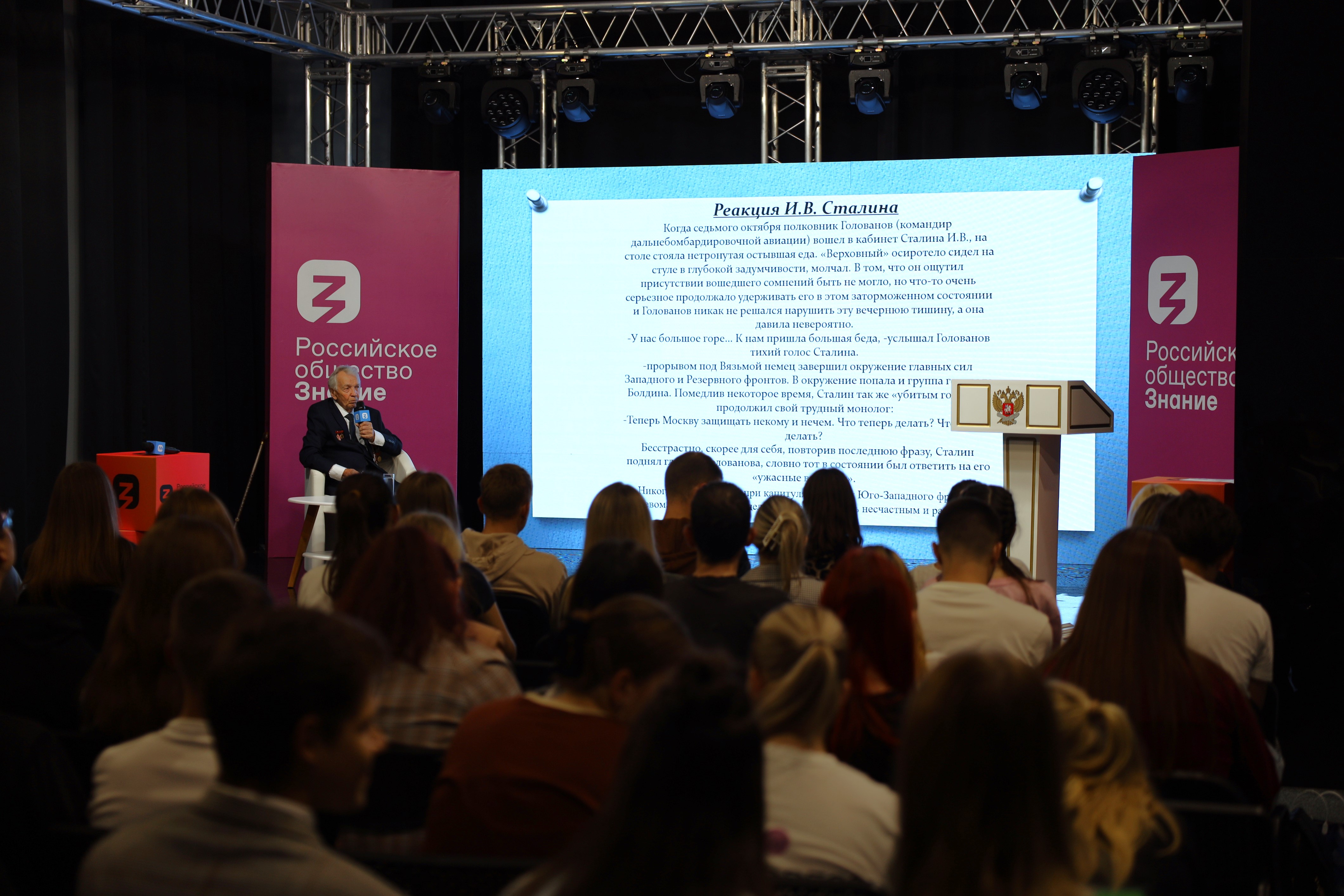 Далее лектор подробно рассказал об обороне Москвы, уделив внимание событиям на Западном фронте, который стал главным направлением удара немецко-фашистских захватчиков. Он осветил ключевые этапы и сражения, подчеркнув героизм и самоотверженность советских солдат. Особое внимание было уделено Смоленскому сражению и боям под Ельней, где родилась советская гвардия.
