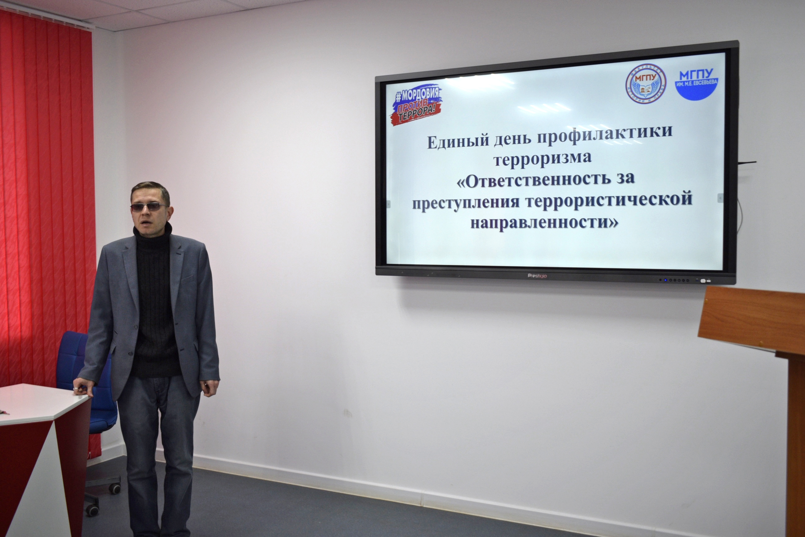 20 октября в рамках Единого дня профилактики терроризма, организованного Антитеррористической комиссией Республики Мордовия, Мордовский государственный педагогический университет имени М. Е. Евсевьева провел ряд мероприятий, направленных на формирование у студентов антитеррористического мировоззрения и повышение бдительности. Тематическая направленность мероприятий – ответственность за преступления террористической направленности. Министр просвещения Сергей Кравцов заявляет, что система образования играет ключевую роль в противодействии идеологии терроризма, проводя комплексную работу по формированию у детей и молодёжи патриотических ценностей, гражданской позиции и нетерпимости к экстремизму. Проведенные мероприятия в МГПУ им. М. Е. Евсевьева являются конкретным воплощением этой стратегии.