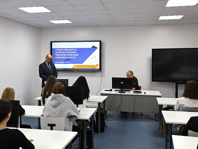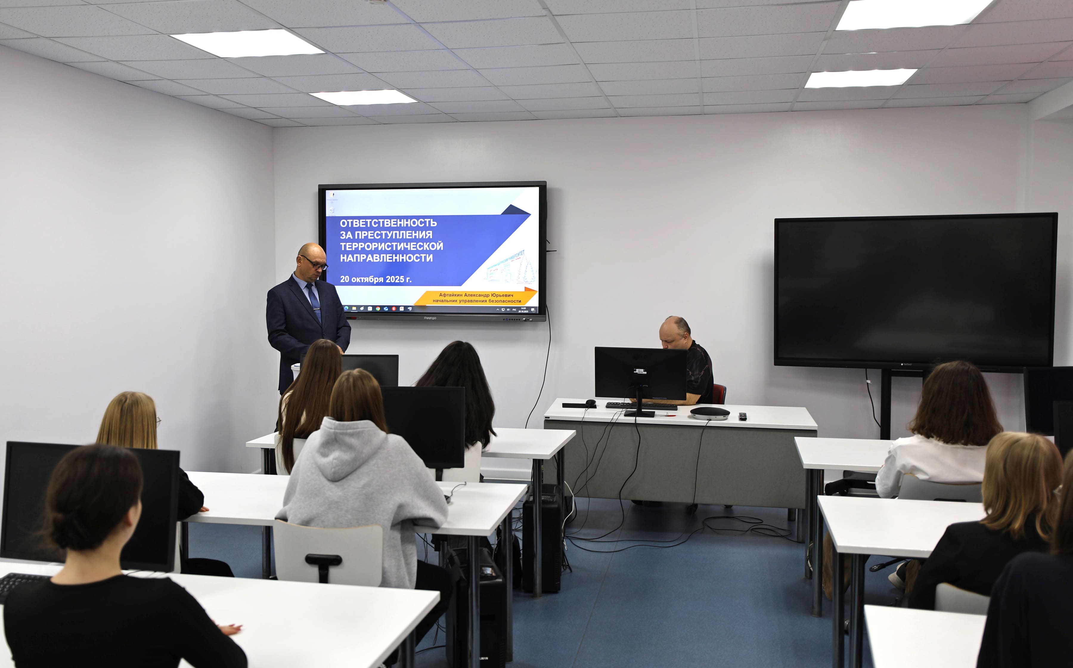 На факультете истории и права состоялась лекция кандидата исторических наук, доцента Владимира Мирошкина, посвященная ответственности за преступления террористической направленности. Особое внимание было уделено разъяснению юридических аспектов и последствий участия в террористической деятельности.