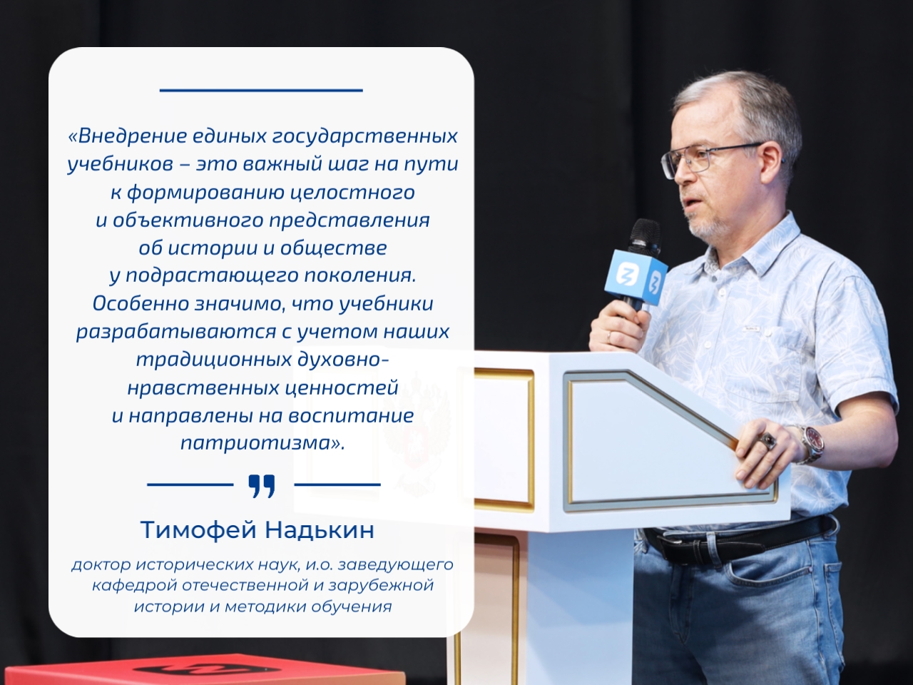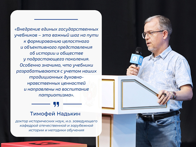 «Внедрение единых государственных учебников – это важный шаг на пути к формированию целостного и объективного представления об истории и обществе у подрастающего поколения. Особенно значимо, что учебники разрабатываются с учетом наших традиционных духовно-нравственных ценностей и направлены на воспитание патриотизма. Для нас, как для педагогического вуза, крайне важно, чтобы будущие учителя имели доступ к самым современным и качественным образовательным материалам, отвечающим вызовам времени. Уверен, что новый учебник истории позволит сформировать у наших студентов компетенции, необходимые для преподавания истории в школе, формирования у школьников исторического мышления, критического взгляда на события прошлого и настоящего».