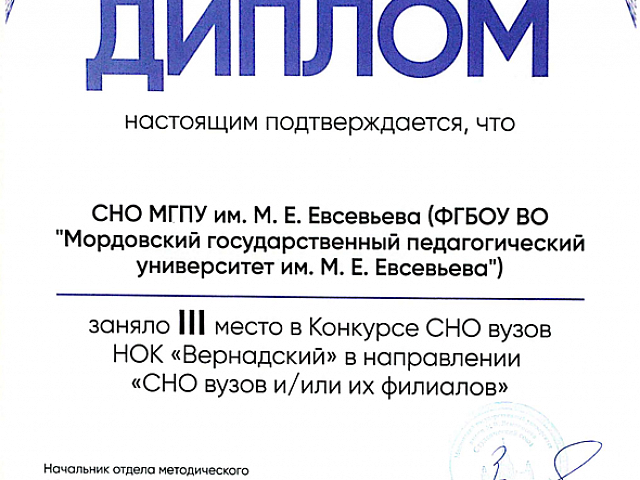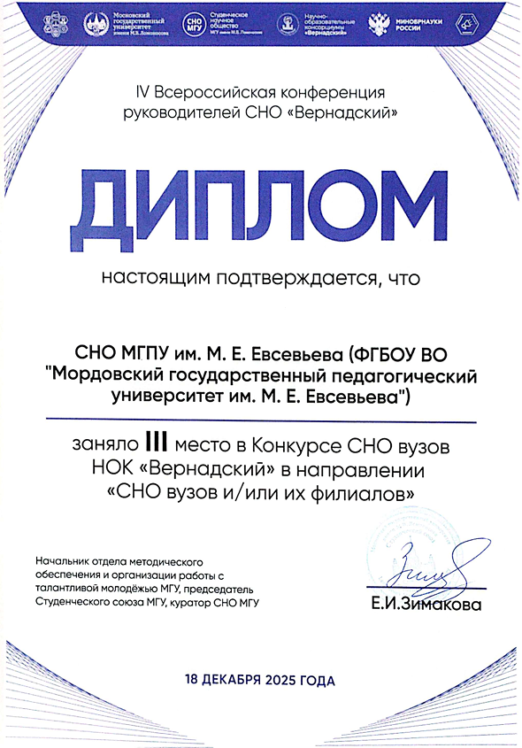 Студенты Мордовского государственного педагогического университета имени М. Е. Евсевьева успешно завершили 2025 год, завоевав призовое 3 место на первом Всероссийском конкурсе студенческих научных обществ вузов научно-образовательных консорциумов «Вернадский». Мероприятие, организованное при поддержке Минобрнауки России, прошло 18-19 декабря в стенах Московского государственного университета имени М. В. Ломоносова и собрало представителей лучших студенческих научных обществ со всей страны. Как отмечает Министр просвещения России Сергей Кравцов: «Поддержка талантливой молодежи, стимулирование их научной деятельности – это инвестиции в будущее нашей страны».