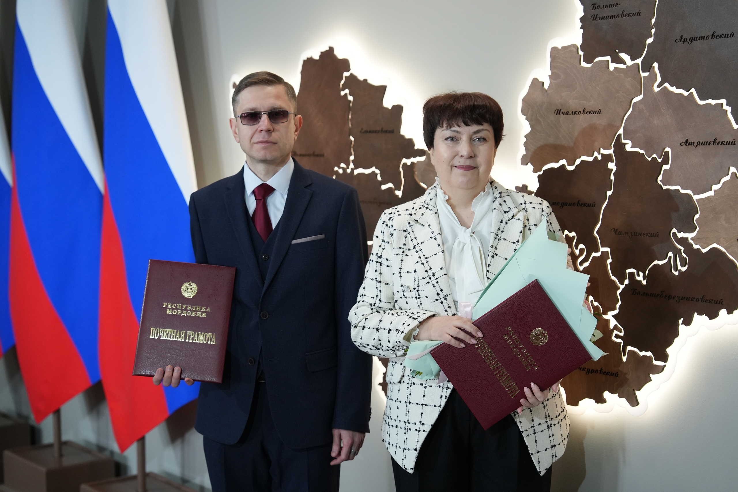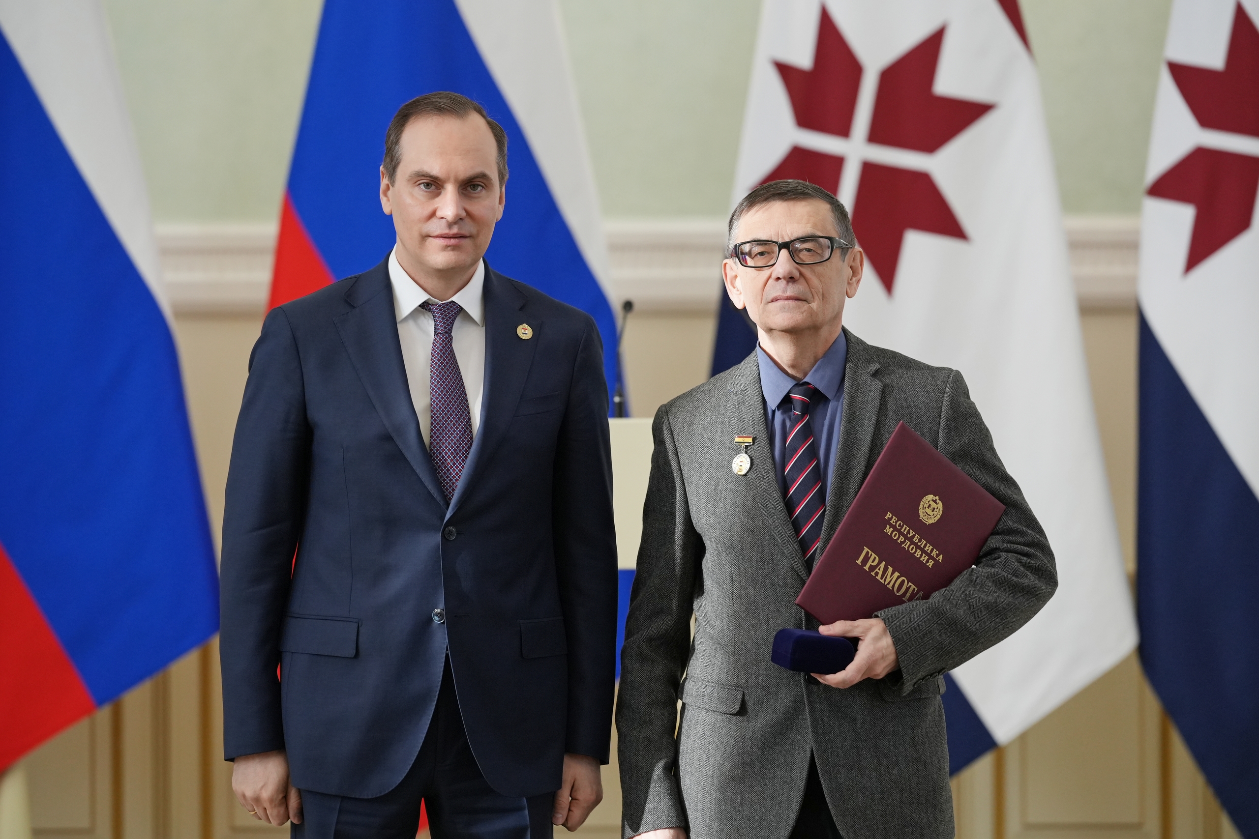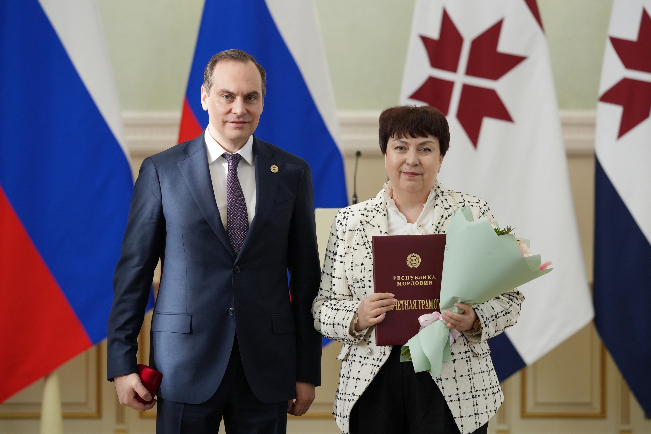 В торжественной обстановке были вручены федеральные и региональные награды, среди которых почетные грамоты и звания получили представители Мордовского государственного педагогического университета: