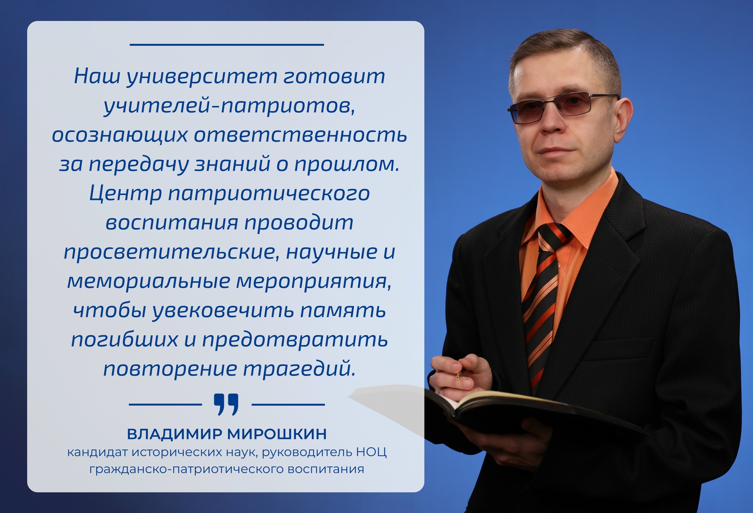 «Всероссийская декада единых действий, посвященная Дню памяти жертв геноцида советского народа, вносит огромный вклад в сохранение исторической правды и формирование исторической памяти у подрастающего поколения. Наш университет считает одной из приоритетных задач подготовку не просто квалифицированных педагогов, а учителей-патриотов, осознающих свою личную ответственность за передачу подлинных знаний о героическом и трагическом прошлом нашей Родины. НОЦ гражданско-патриотического воспитания ведет системную работу по организации просветительских мероприятий, научно-исследовательских проектов и мемориальных акций, направленных на увековечивание памяти миллионов мирных советских граждан, ставших жертвами нацистского геноцида. Мы стремимся к тому, чтобы каждый будущий педагог глубоко осознал недопустимость повторения подобных трагедий и умел доносить эту непреходящую истину до своих учеников».