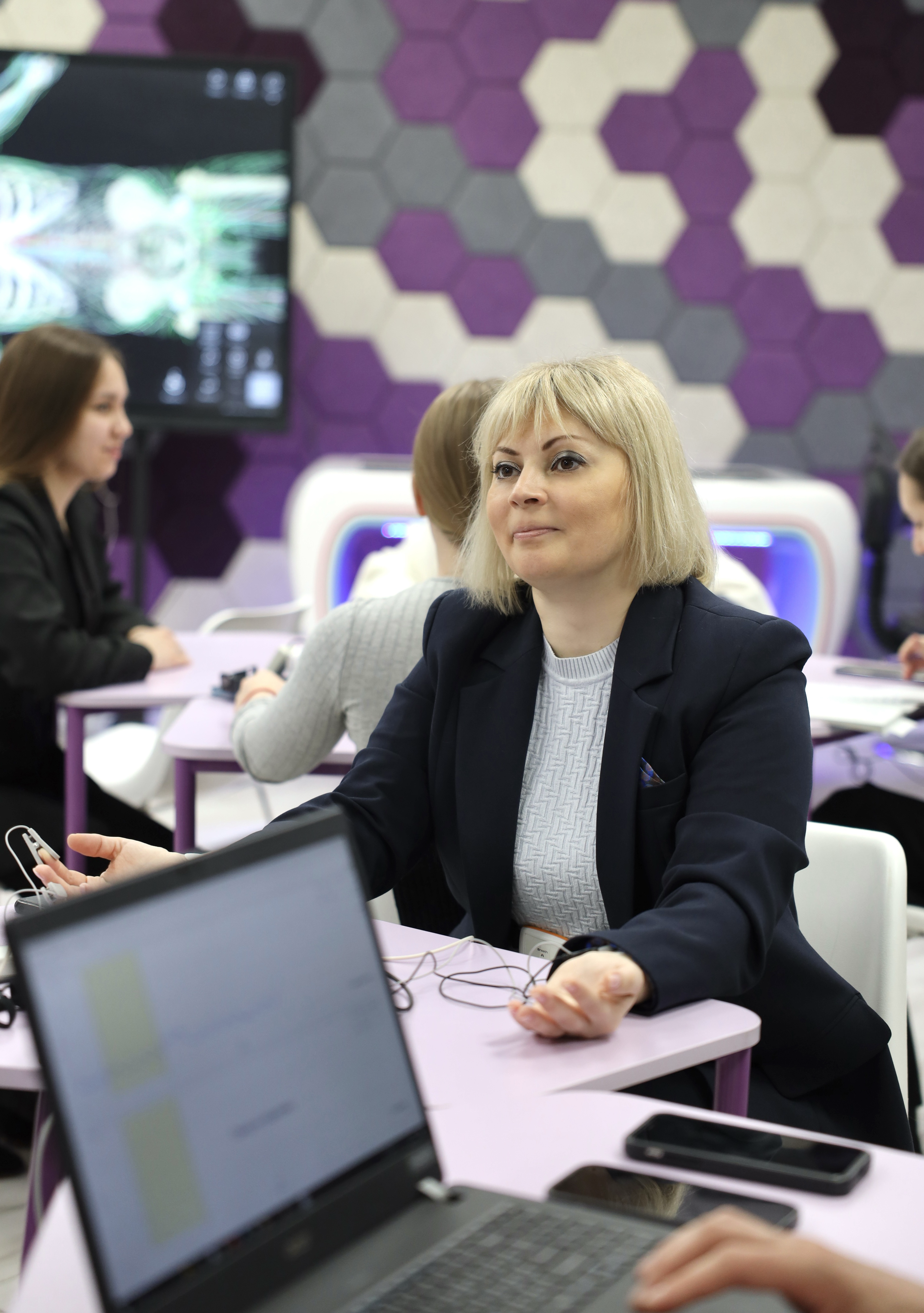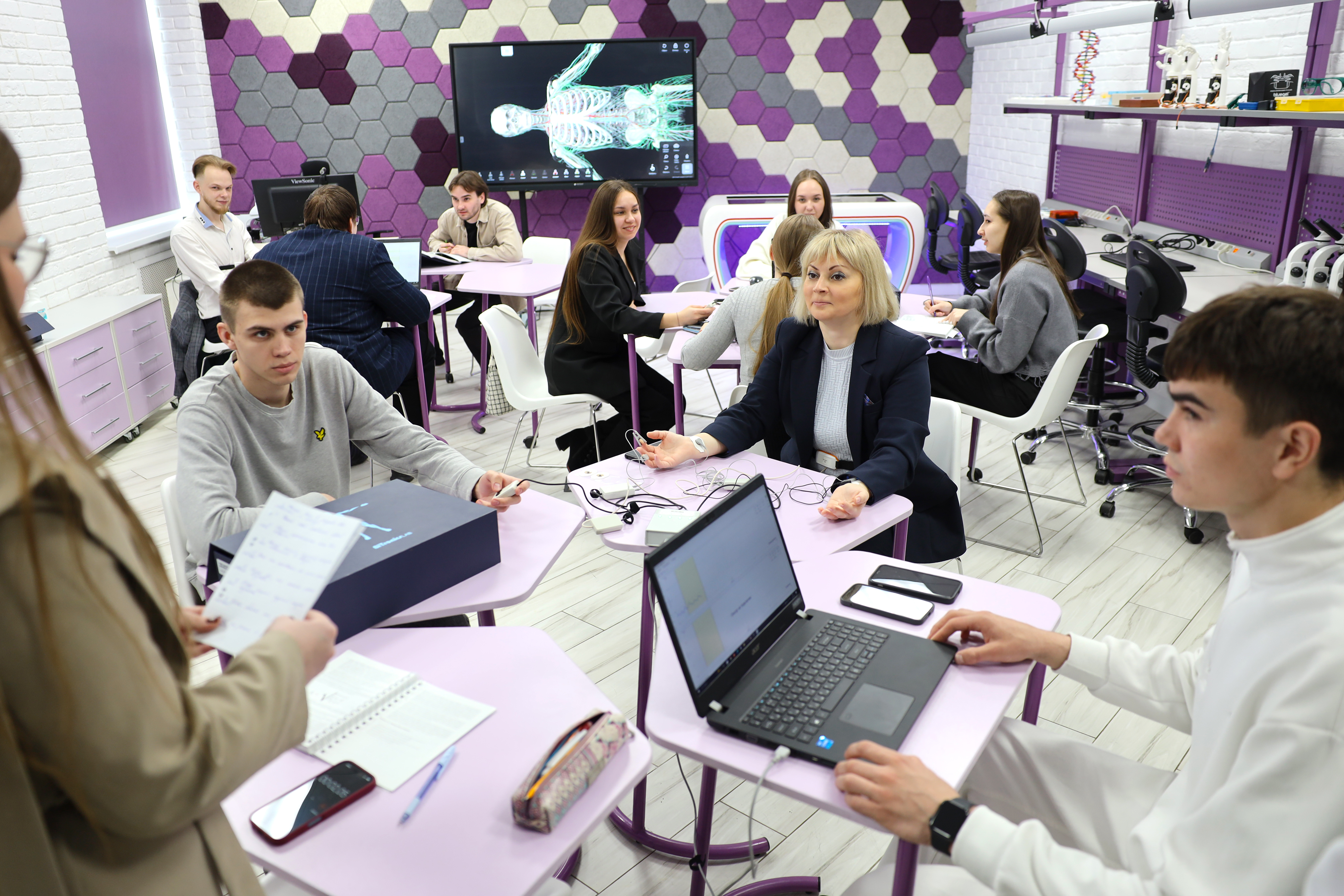 В Технопарке универсальных педагогических компетенций университета гости вместе со студентами приняли участие в опытно-экспериментальных работах по химии, физике и биологии. Обучающиеся показали, как функционируют роботизированные управляемые системы, собираются и программируются модели роботов, используются альтернативные источники энергии. Ольга Павловна протестировала на себе работу современного полиграфа.
