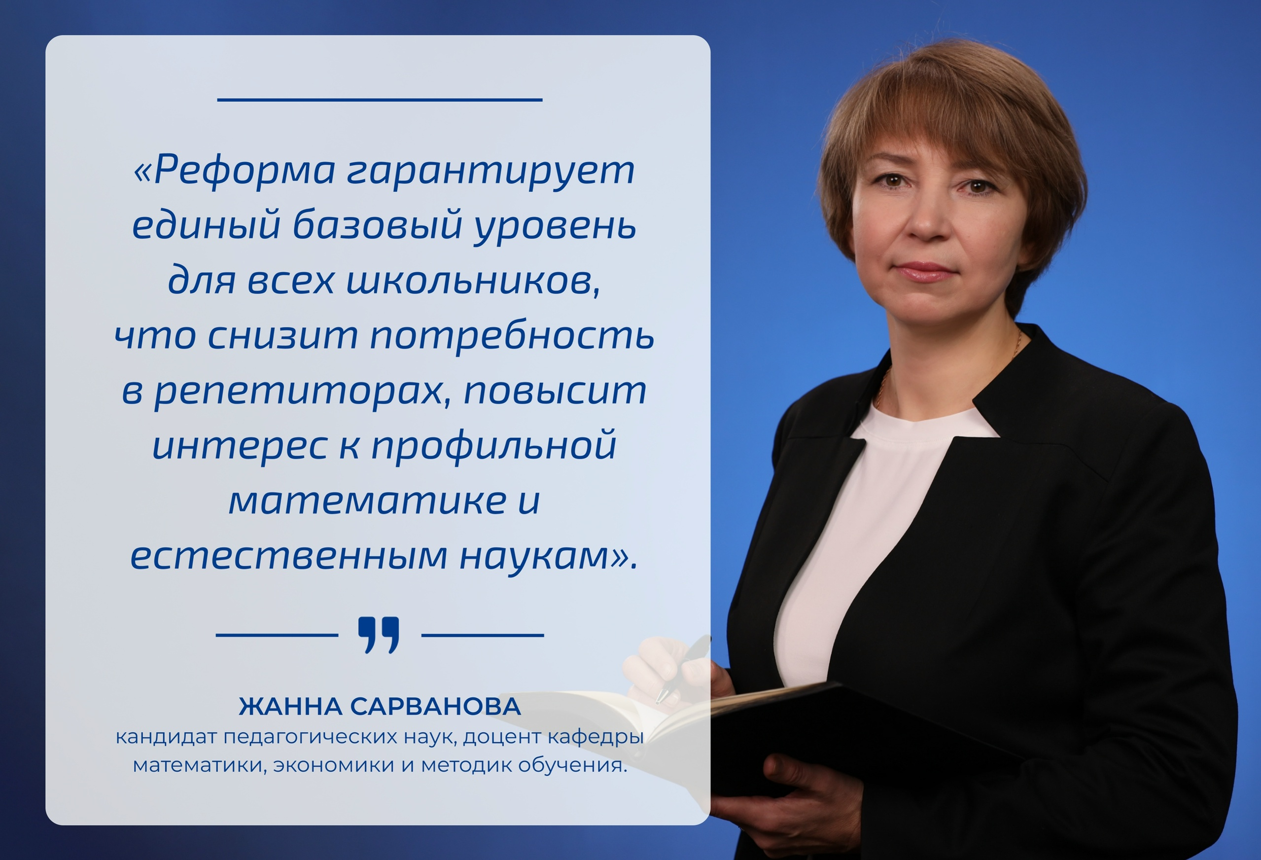 О ключевых аспектах, потенциале и условиях успеха этой реформы мы поговорили с Жанной Сарвановой, кандидатом педагогических наук, доцентом кафедры математики, экономики и методик обучения.
