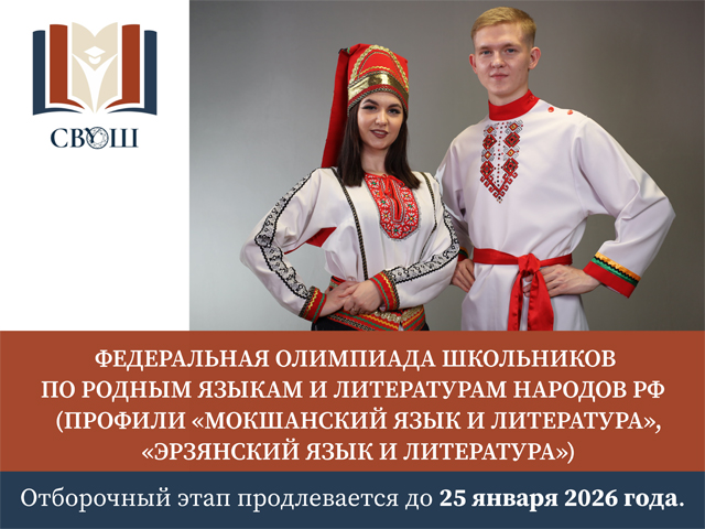Успей принять участие! Продлен первый этап олимпиады по родным языкам народов РФ! С радостью сообщаем, что первый (отборочный) этап Федеральной олимпиады школьников по родным языкам и литературам народов РФ продлевается до 25 января 2026 года. Приглашаем Вас принять участие в олимпиаде по профилям «Мокшанский язык и литература», «Эрзянский язык и литература».