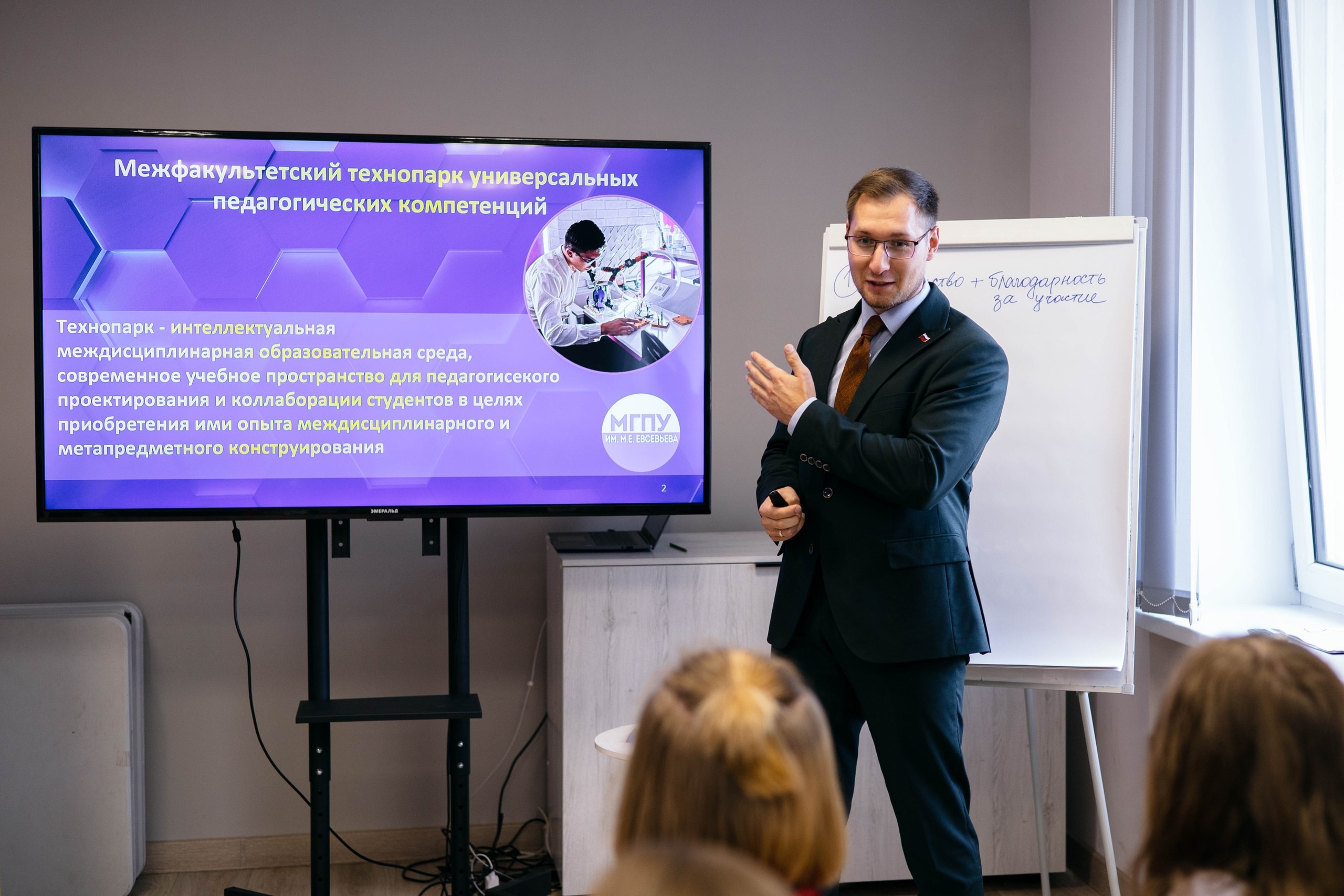 Ключевым моментом мероприятия стала практическая сессия от Михаила Семикова, директора Межфакультетского технопарка универсальных педагогических компетенций МГПУ им. М.Е. Евсевьева. Он представил собравшимся ресурсную базу Межфакультетского технопарка и педагогического Кванториума, отметив их потенциал для реализации волонтерских проектов.