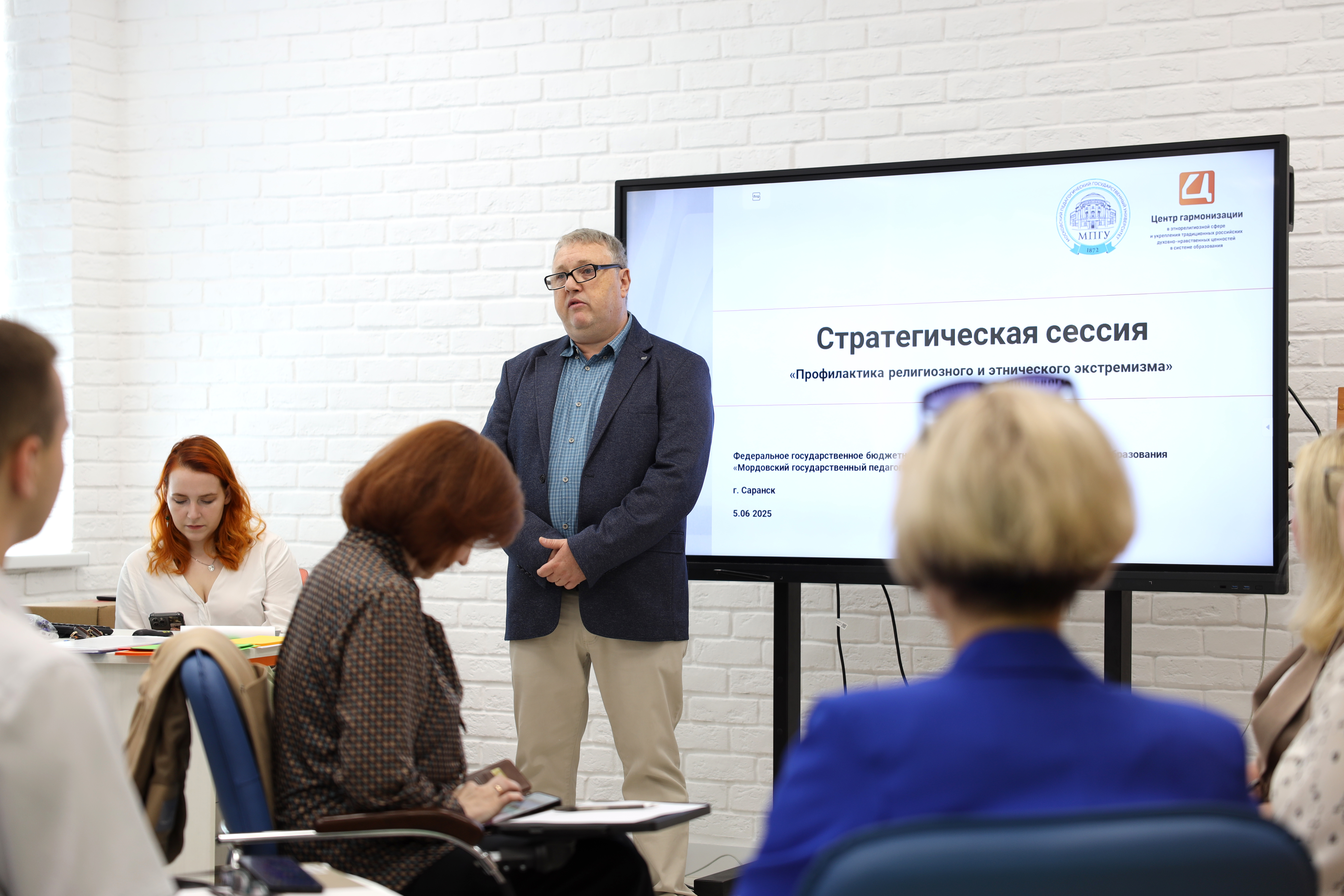 5 июня Мордовский государственный педагогический университет имени М. Е. Евсевьева стал площадкой для проведения стратегической сессии, посвященной актуальной и социально значимой проблематике профилактики экстремизма на религиозной и этнической почве в молодежной среде. Инициаторами мероприятия выступили представители Министерства просвещения Российской Федерации: заместители директора Центра гармонизации в этнорелигиозной сфере и укрепления традиционных российских духовно-нравственных ценностей в системе образования Минпросвещения РФ Анна Дмитриевна Тишкова и Игорь Константинович Кручко, начальник медиаотдела Марина Алексеевна Малафеева, а также начальник психолого-методического отдела Софья Алексеевна Егорова.